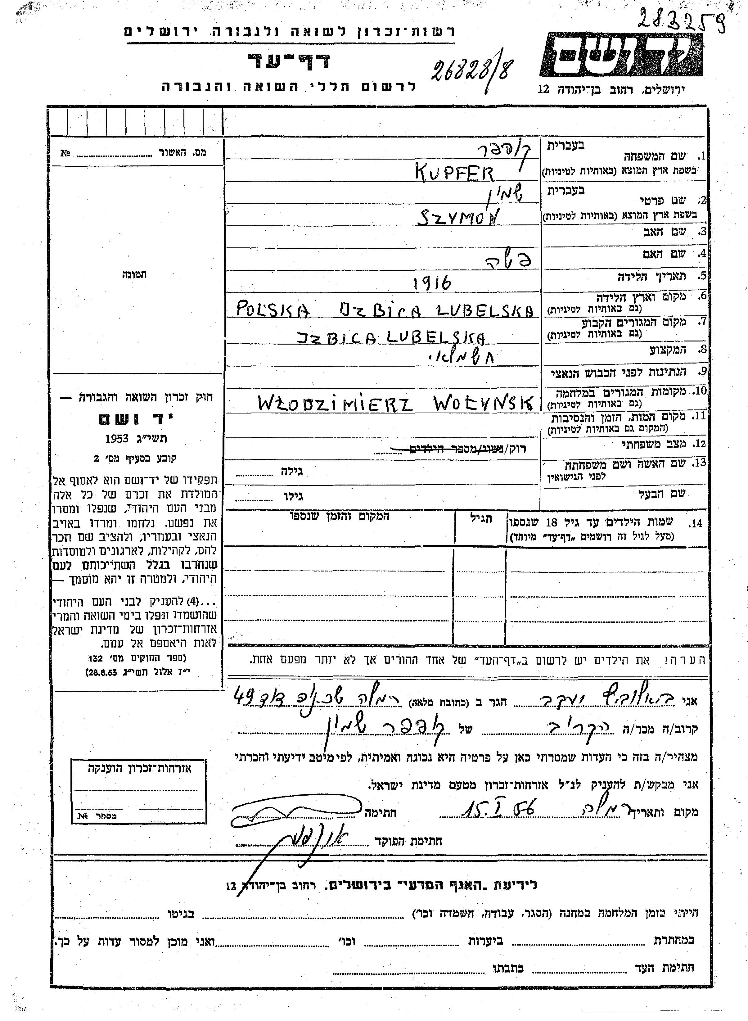 Купфер Шимон 1916 Избица-Любельска, Польша Лист свидетельских показаний