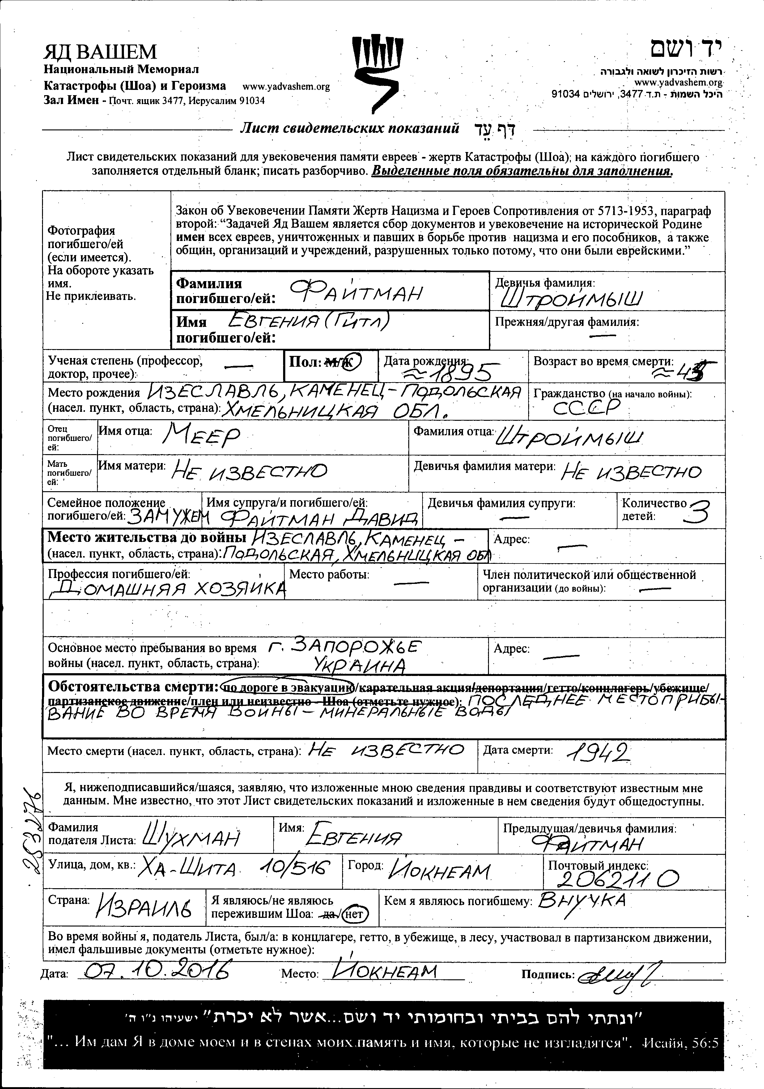 Файтман Евгения Гитл 1895 Изяславль, Украина (СССР) Лист свидетельских показаний
