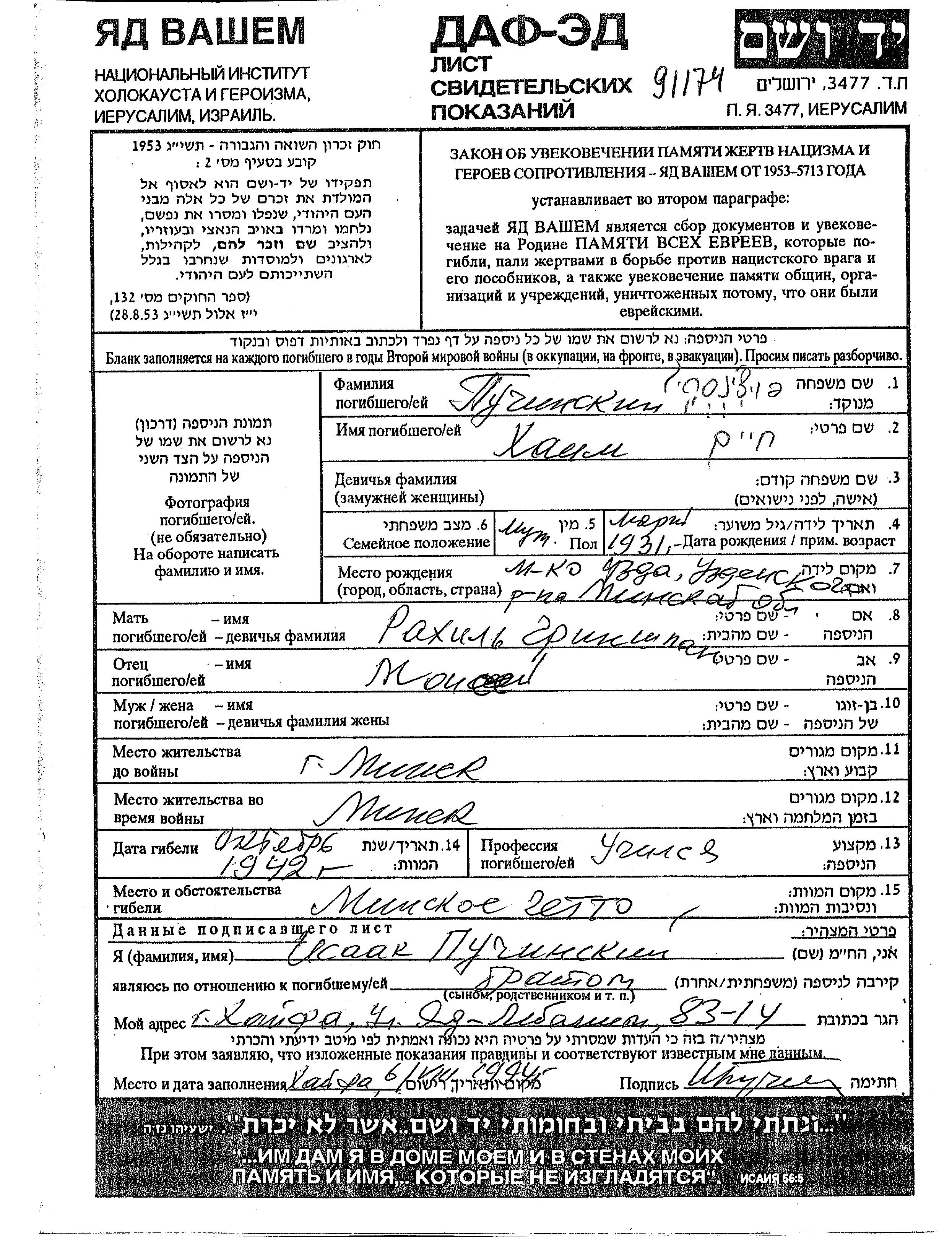 Пучински Хаим 1931 Минск, Белоруссия (СССР) Лист свидетельских показаний