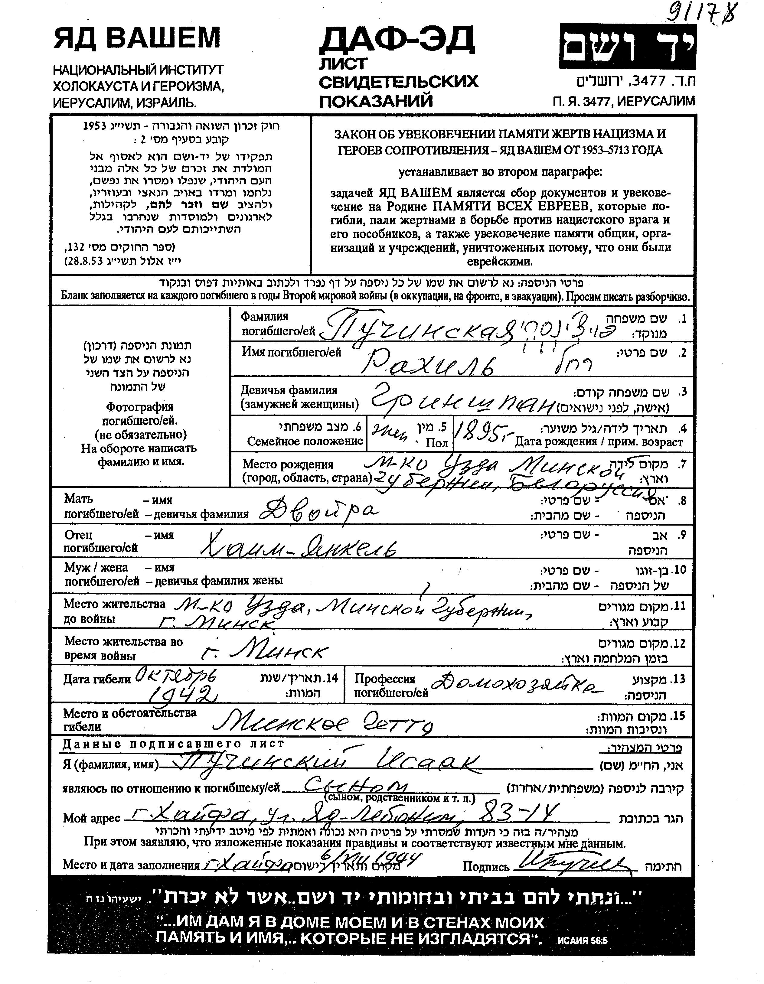 Яд Вашем - Листы свидетельских показаний Мемориального фонда