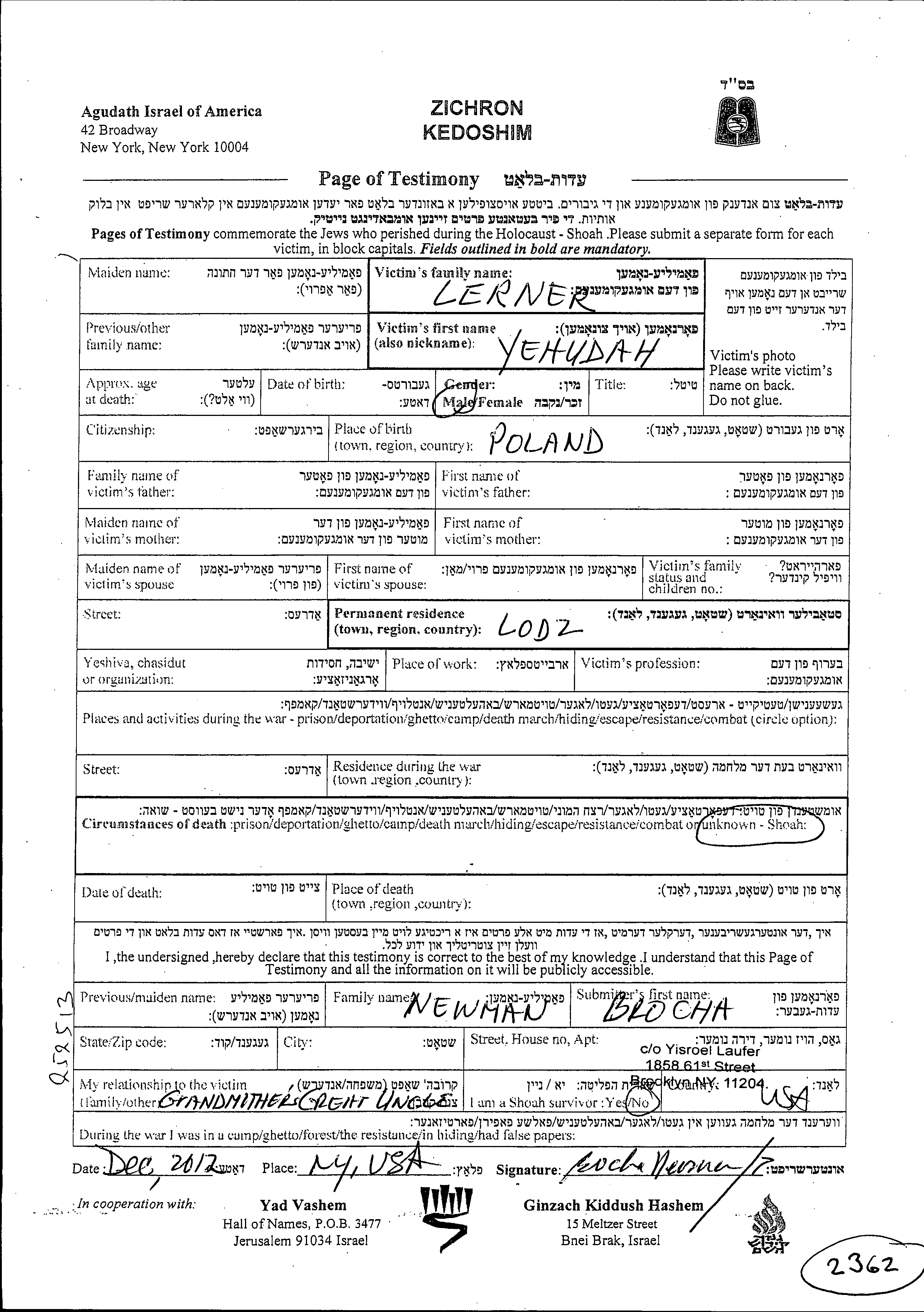Поиск подателя Листа свидетельских показаний. Поиск по любому имени, включая уменьшительное или прозвище