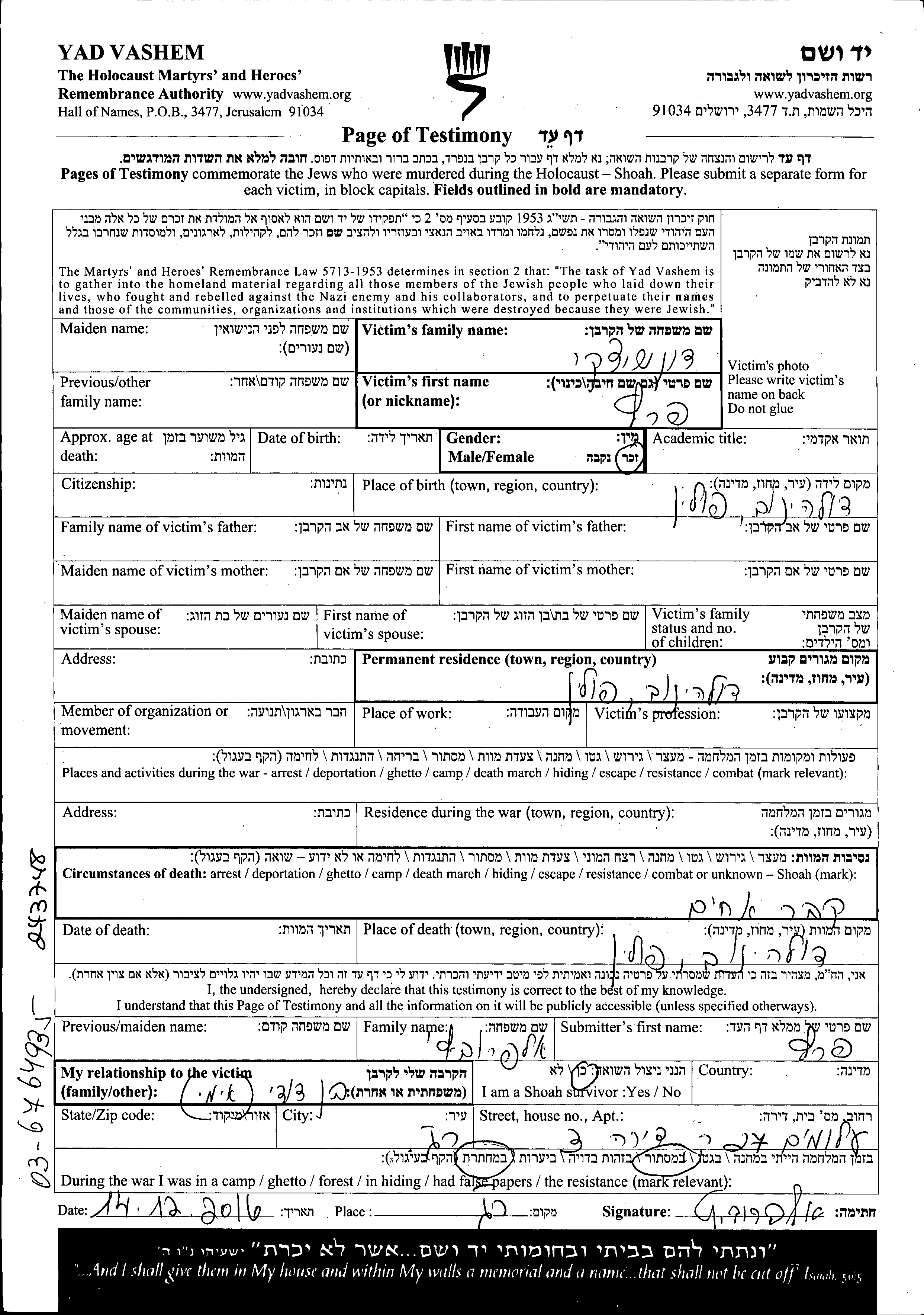 Яд Вашем - Листы свидетельских показаний Мемориального фонда