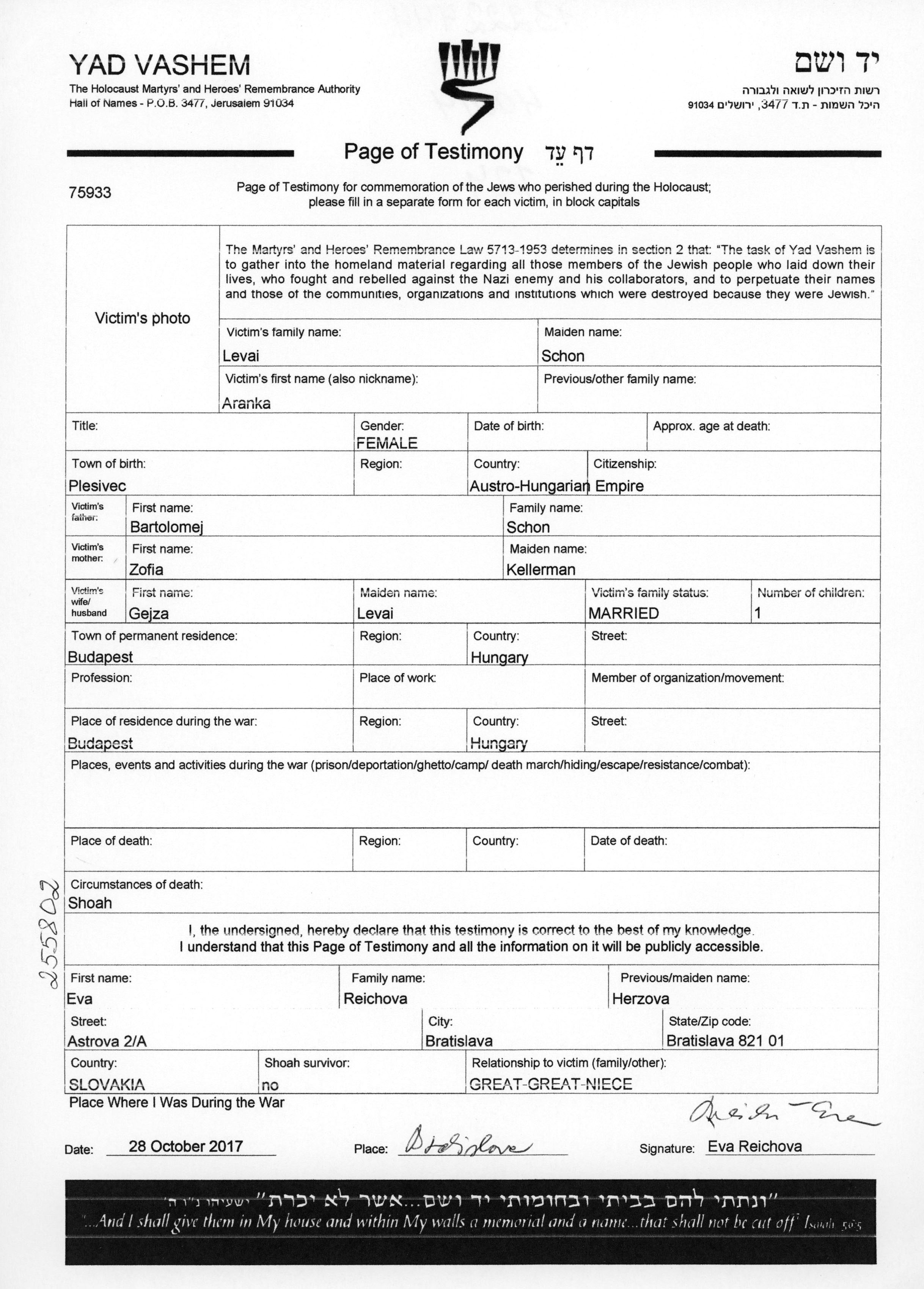 Аранка Леваи, девичья фамилия Шон, место рождения: Плешивец, Чехословакия. Отец: Бартоломей, mать:Зофия, девичья фамилия Келлерман. Женат / замужем. Место жительства до войны: Будапешт, Венгрия. Место во время войны: Будапешт, Венгрия.