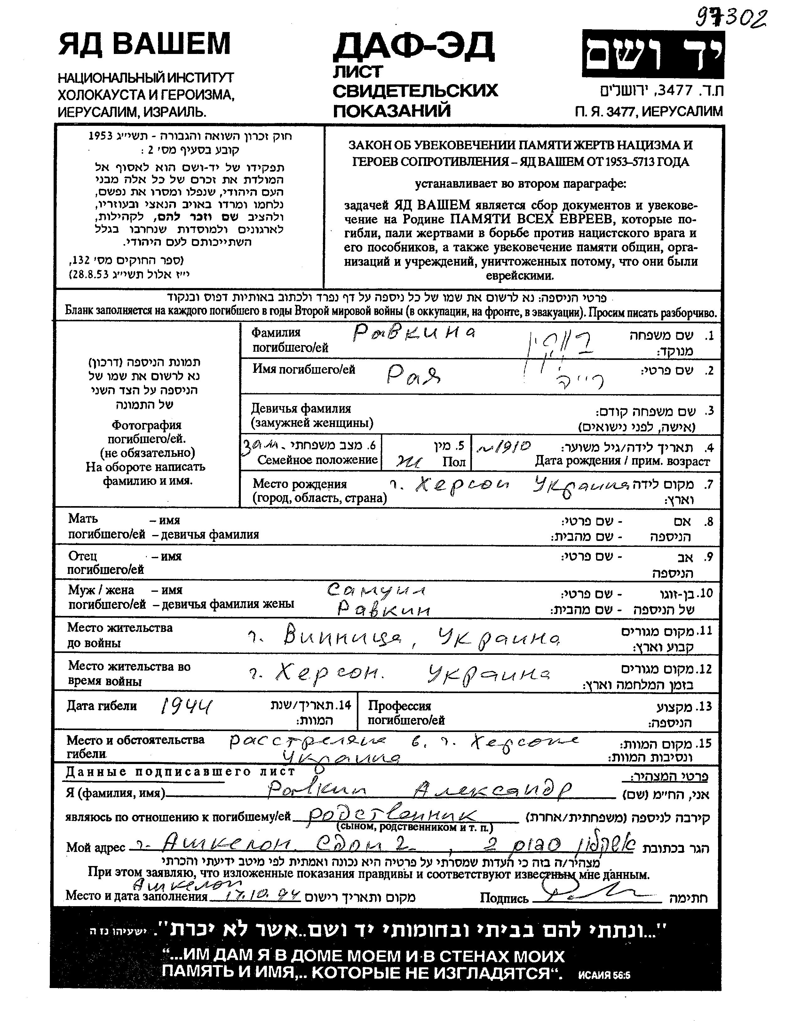 Яд Вашем - Листы свидетельских показаний Мемориального фонда
