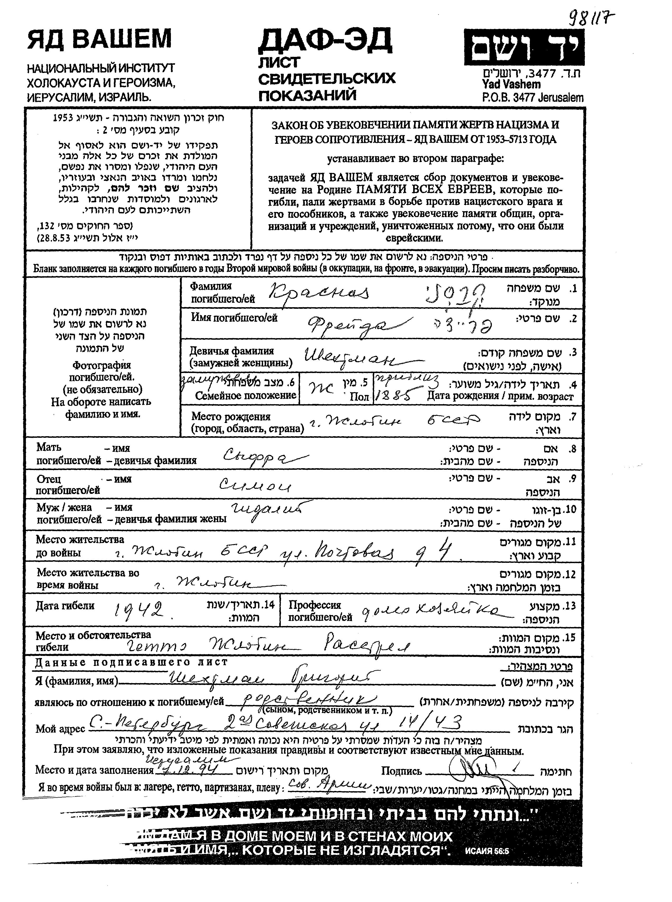Фрейда Красный, девичья фамилия Шехтман, место рождения: Жлобин, Белоруссия (СССР). Отец: Симон, mать:Шифра. Домохозяйка. Женат / замужем. Место жительства до войны: Жлобин, Белоруссия (СССР). Место во время войны: Жлобин, Белоруссия (СССР).