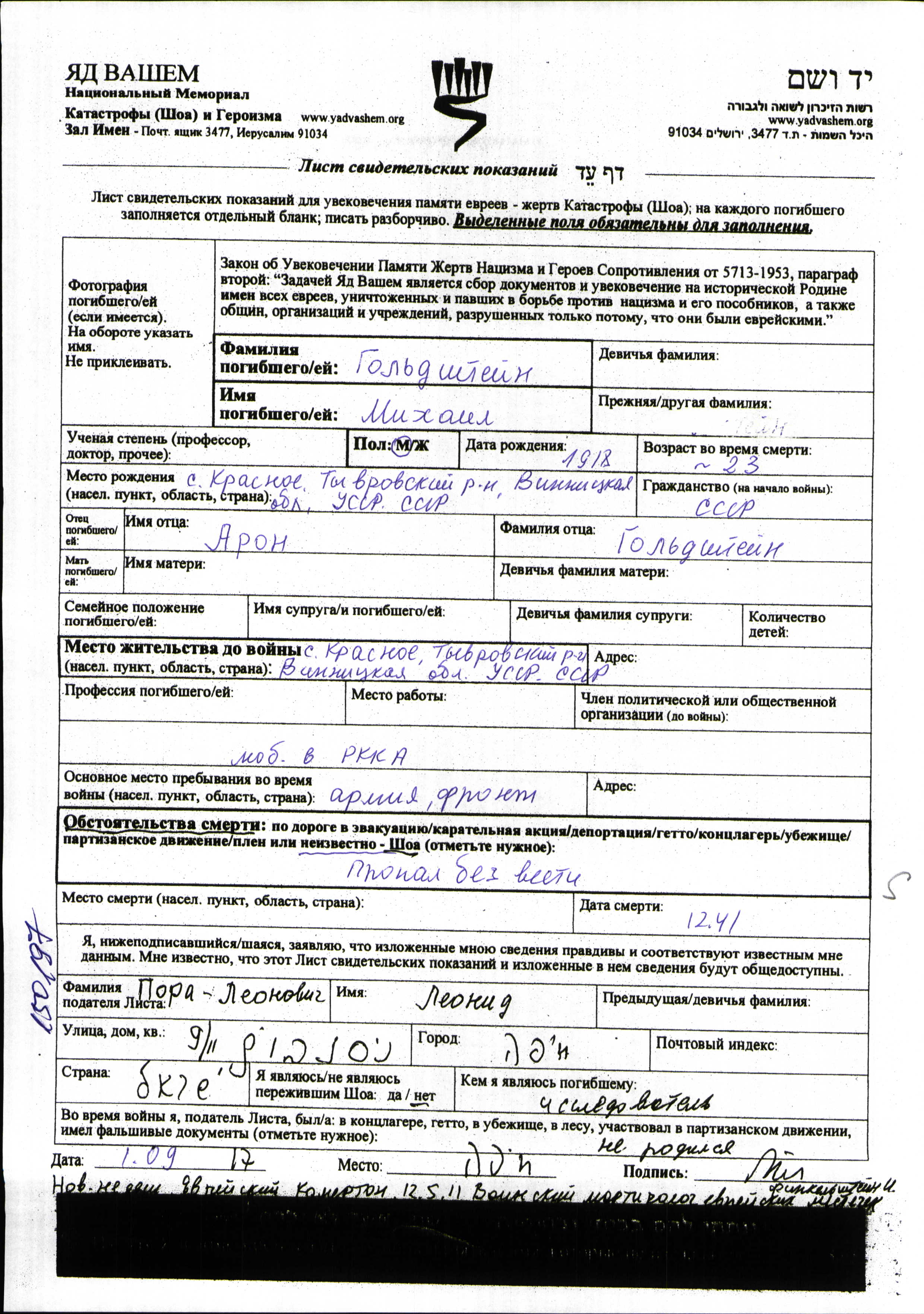 Гольдштейн Михаил 1918 Красное, Украина (СССР) Лист свидетельских показаний