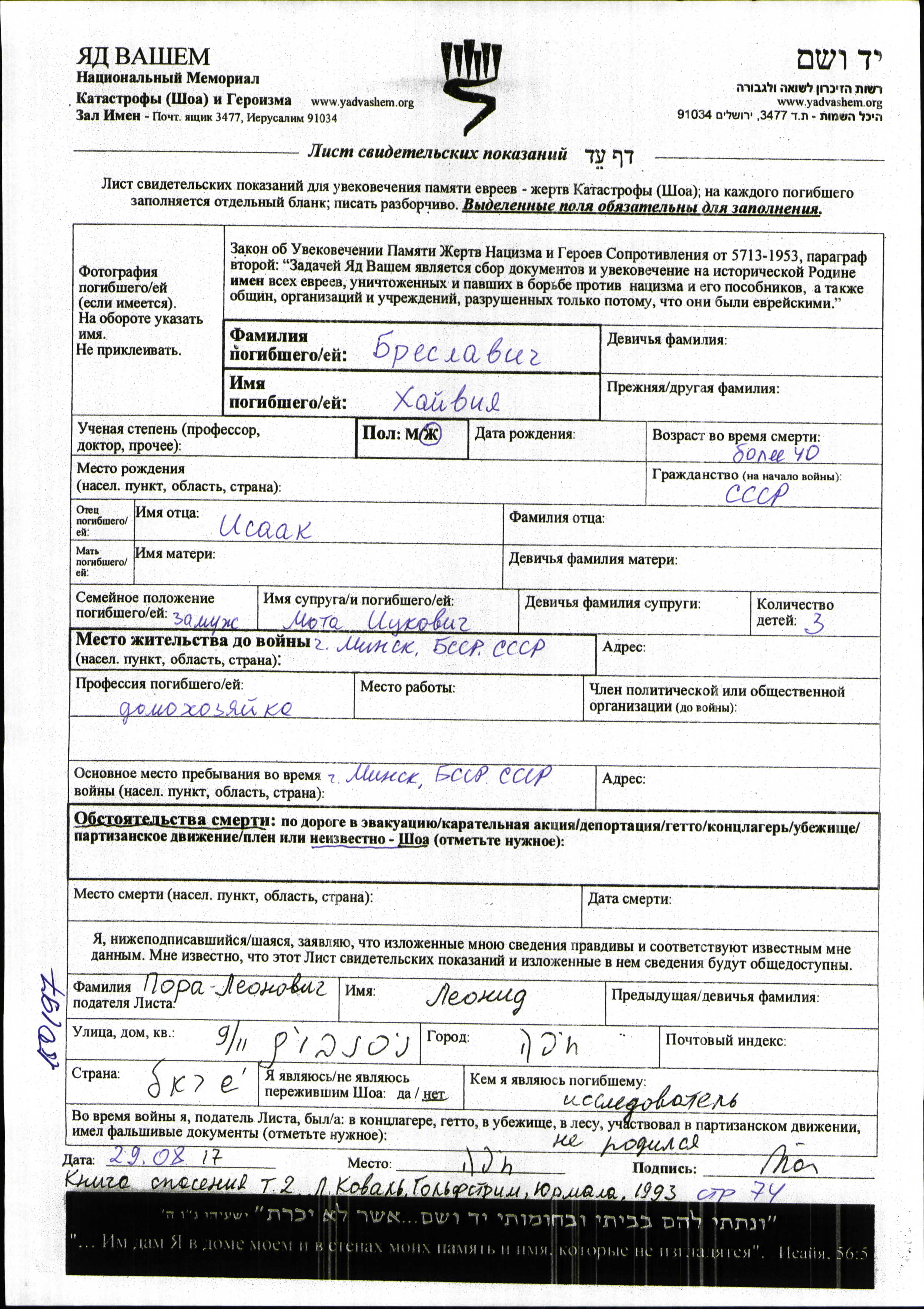 Бреславич Хаивя Минск, Белоруссия (СССР) Лист свидетельских показаний