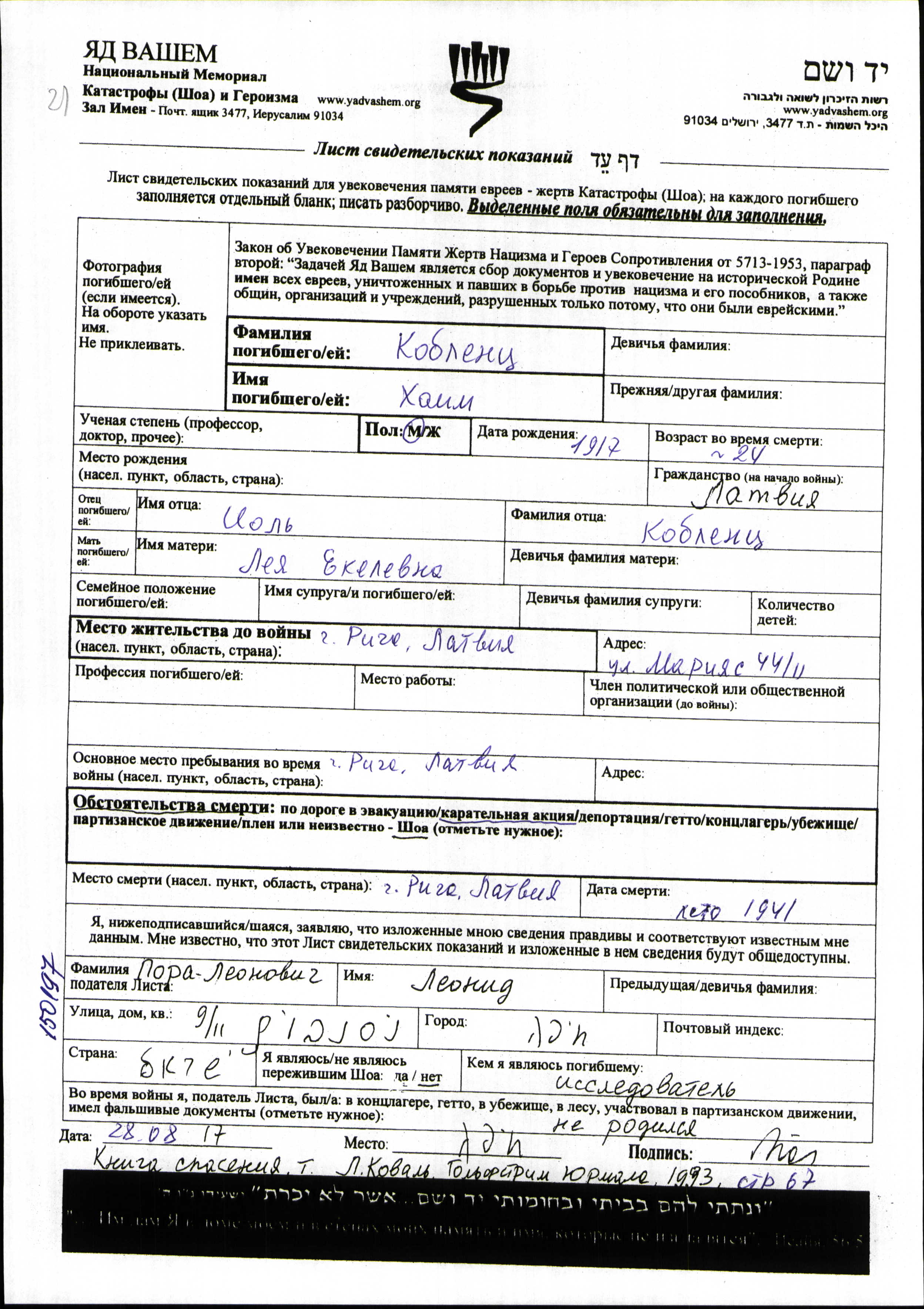 Кобленц Хаим 1917 Рига, Латвия Лист свидетельских показаний