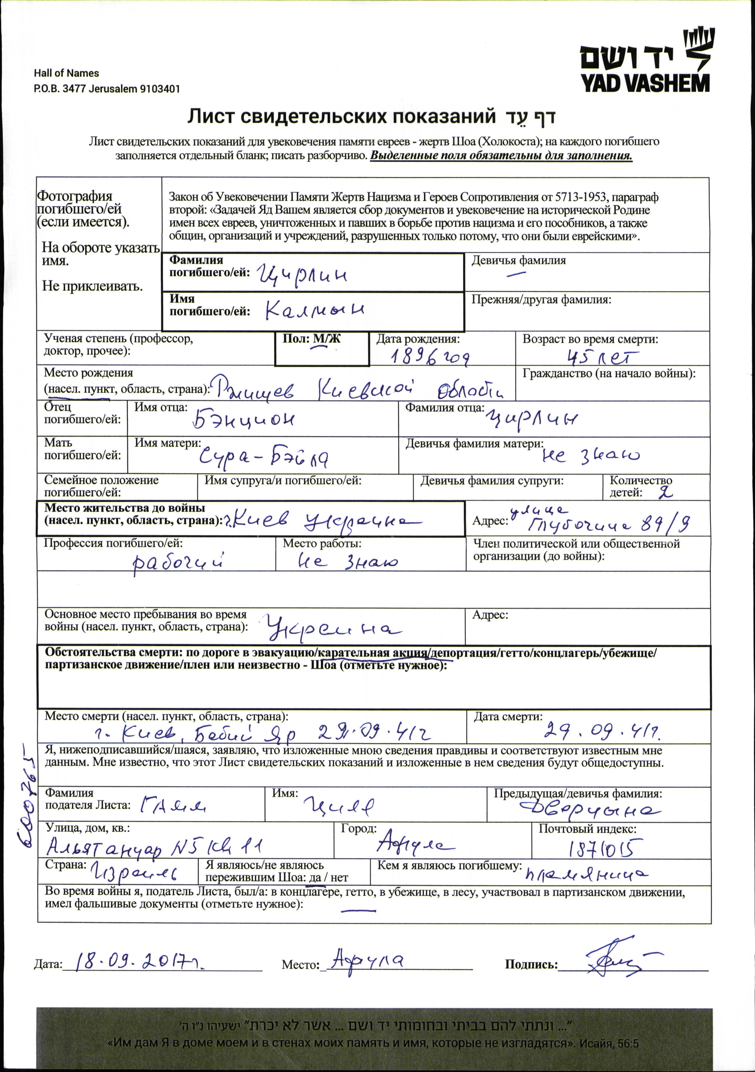Яд Вашем - Листы свидетельских показаний Мемориального фонда