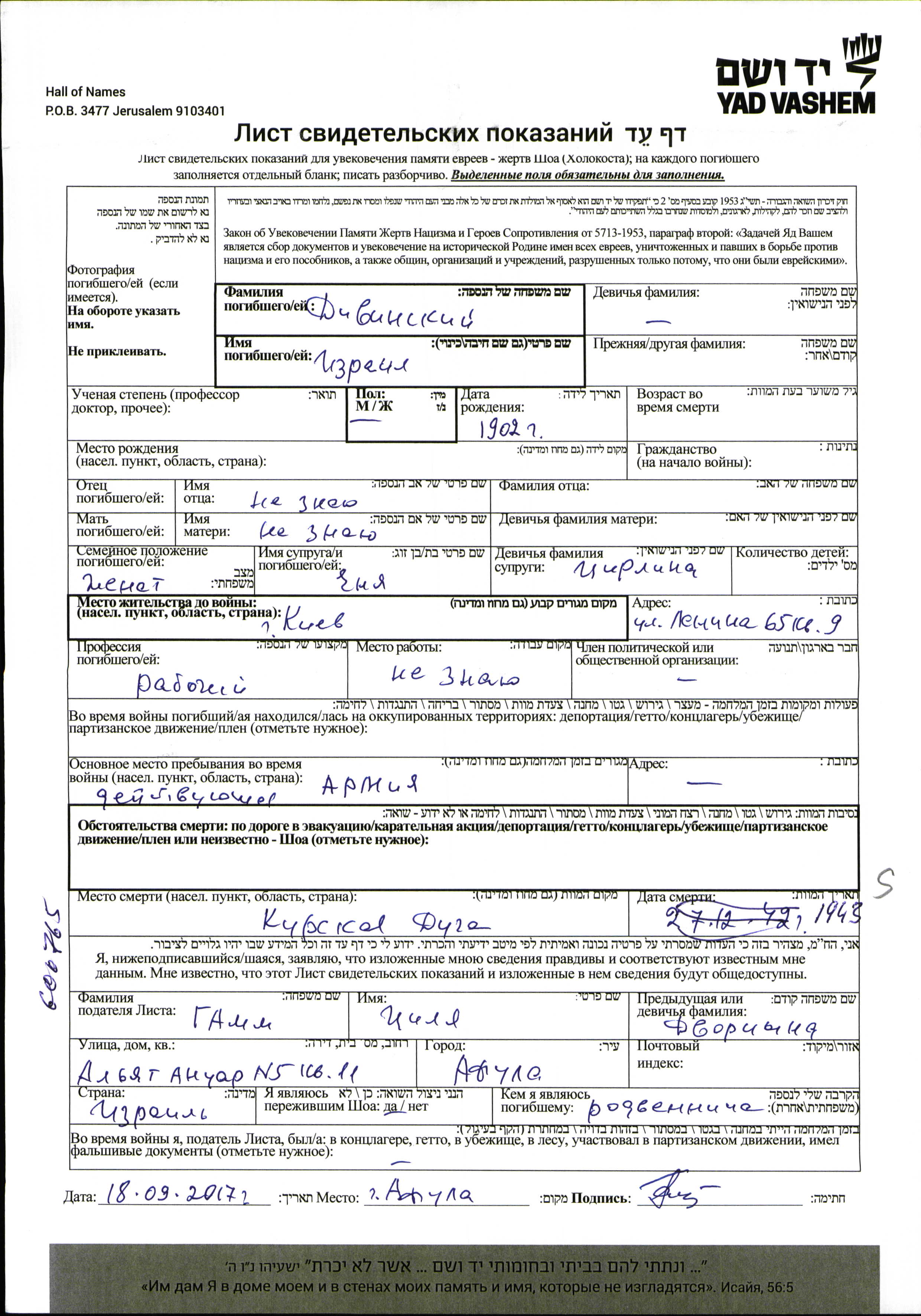 Изреиль Дивинский. Рабочий / рабочая. Женат / замужем. Место жительства до войны: Киев, Украина (СССР). Место во время войны: Вооруженные силы Советского Союза. Изреиль погиб на военной службе. место смерти: Kurskaya Duga, Россия (СССР) в 1943.