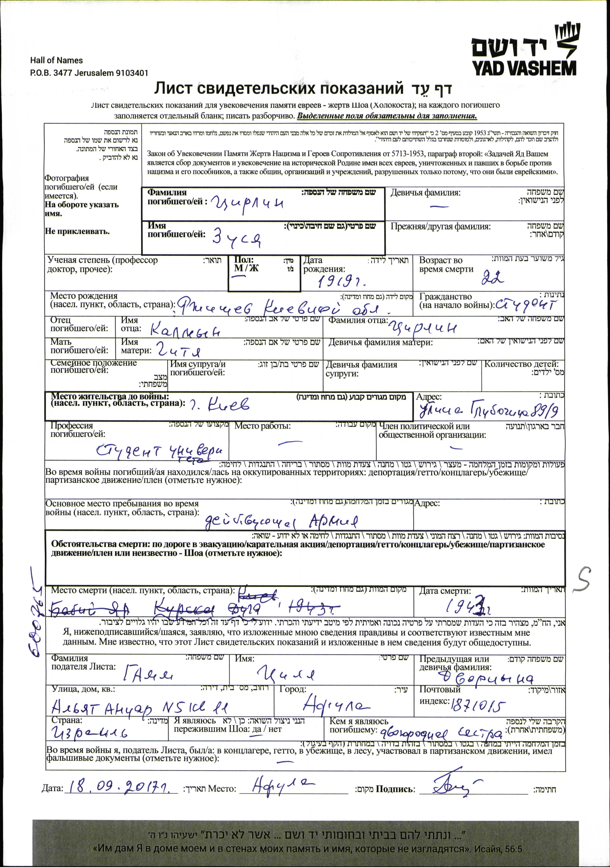 Зуся Цирлин, место рождения: Ржищев, Украина (СССР). Отец: Кальмин, mать:Гитя. Студент / студентка. Место жительства до войны: Киев, Украина (СССР). Место во время войны: Вооруженные силы Советского Союза. Зуся погиб на военной службе. место смерти: неизвестно в 1941.