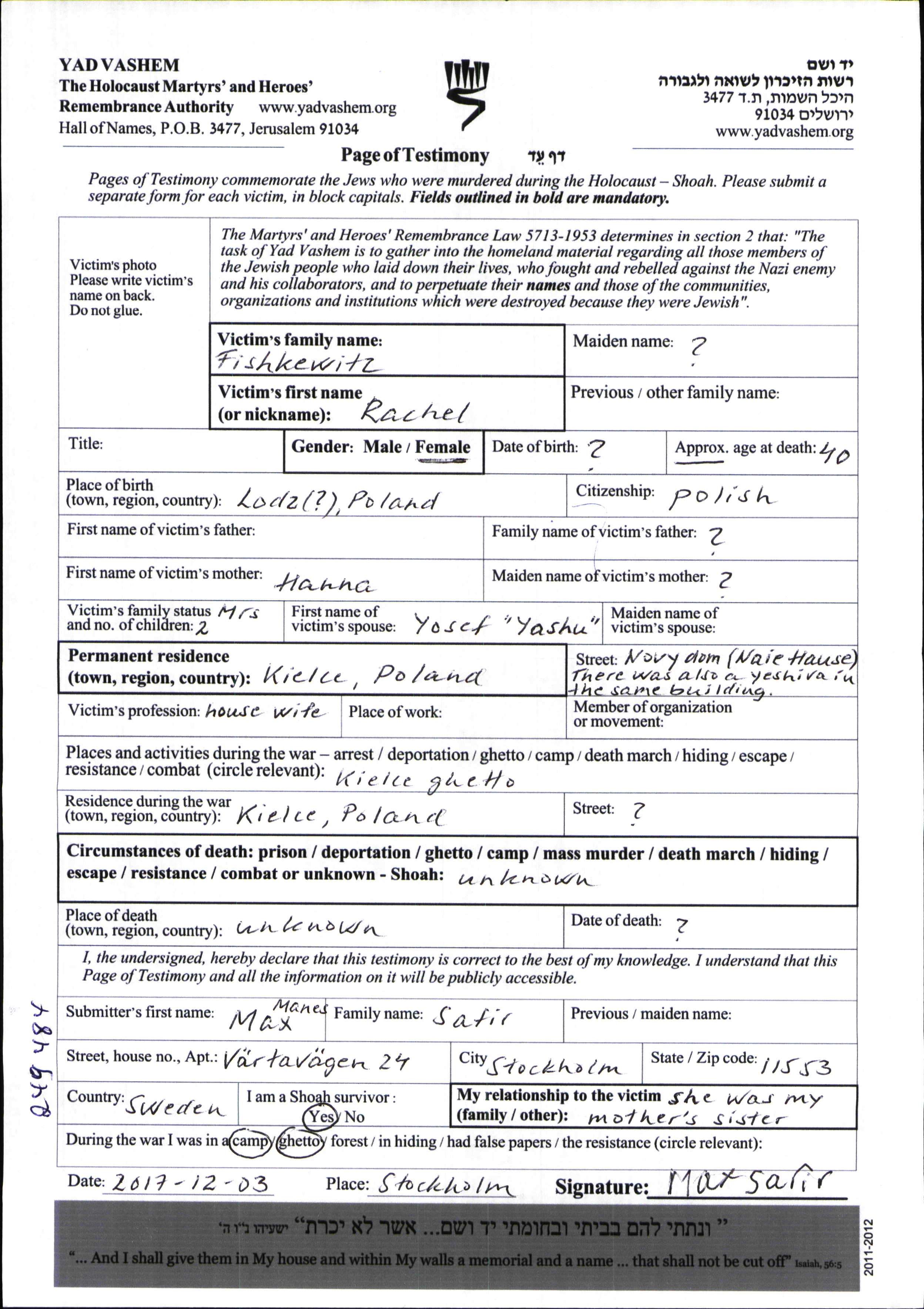 Рахель Фишкевиц, место рождения: Лодзь, Польша.Mать:Ханна. Домохозяйка. Женат / замужем. Место жительства до войны: Кельце, Польша. Место во время войны: Кельце, Польша.