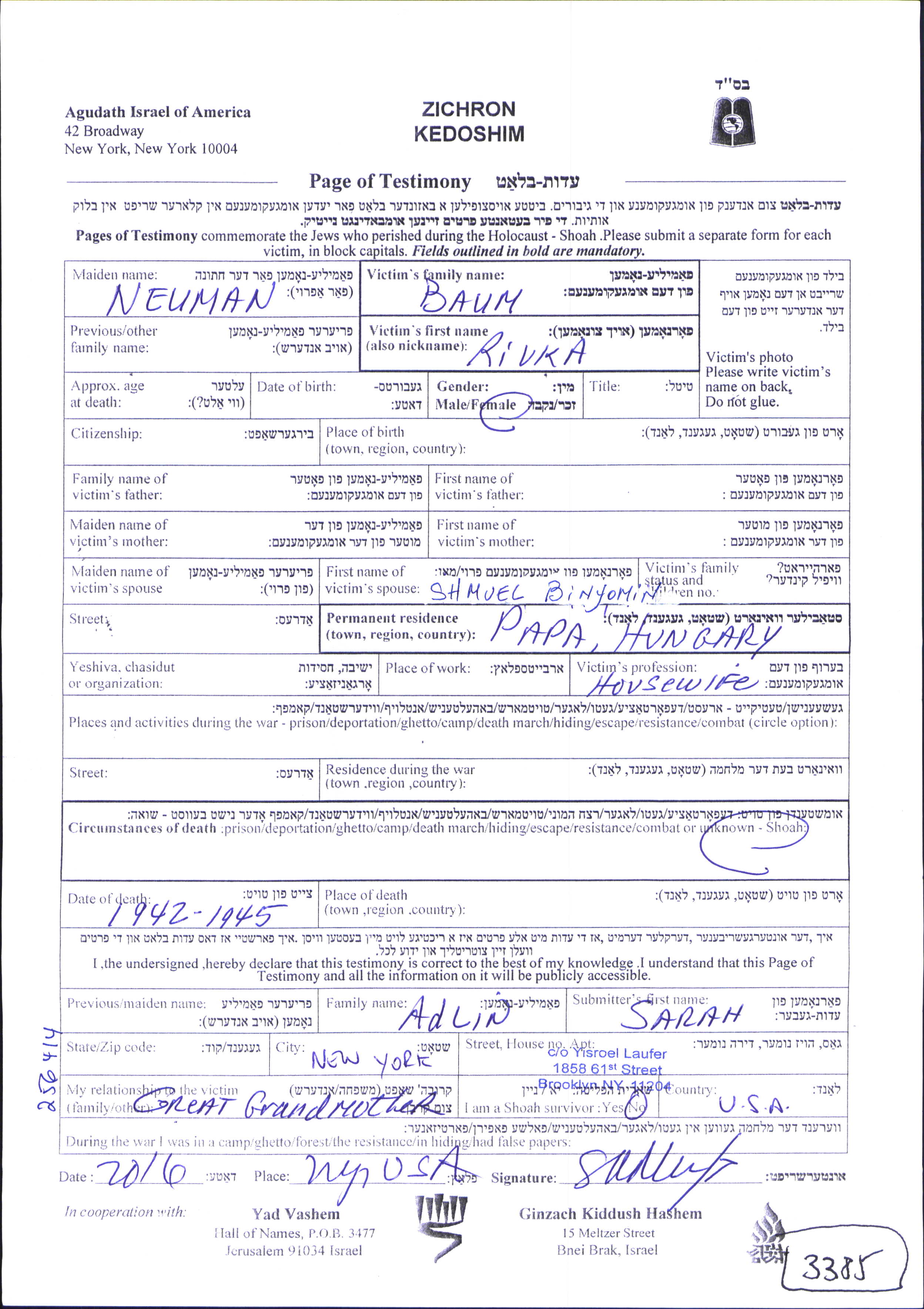 Баум Ривка Папа, Венгрия Лист свидетельских показаний