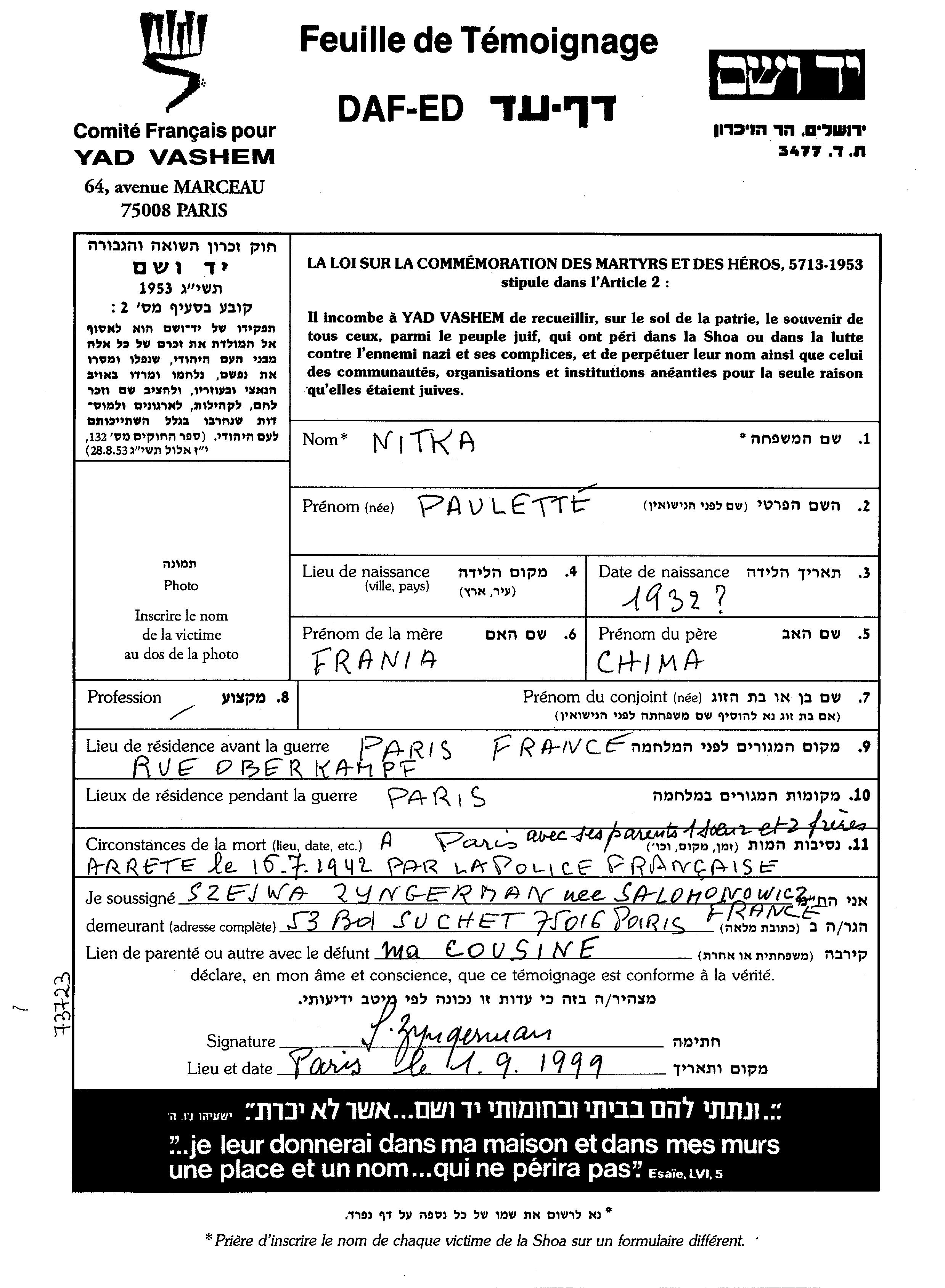 Полетт Нитка. Место жительства до войны: Париж, Франция.