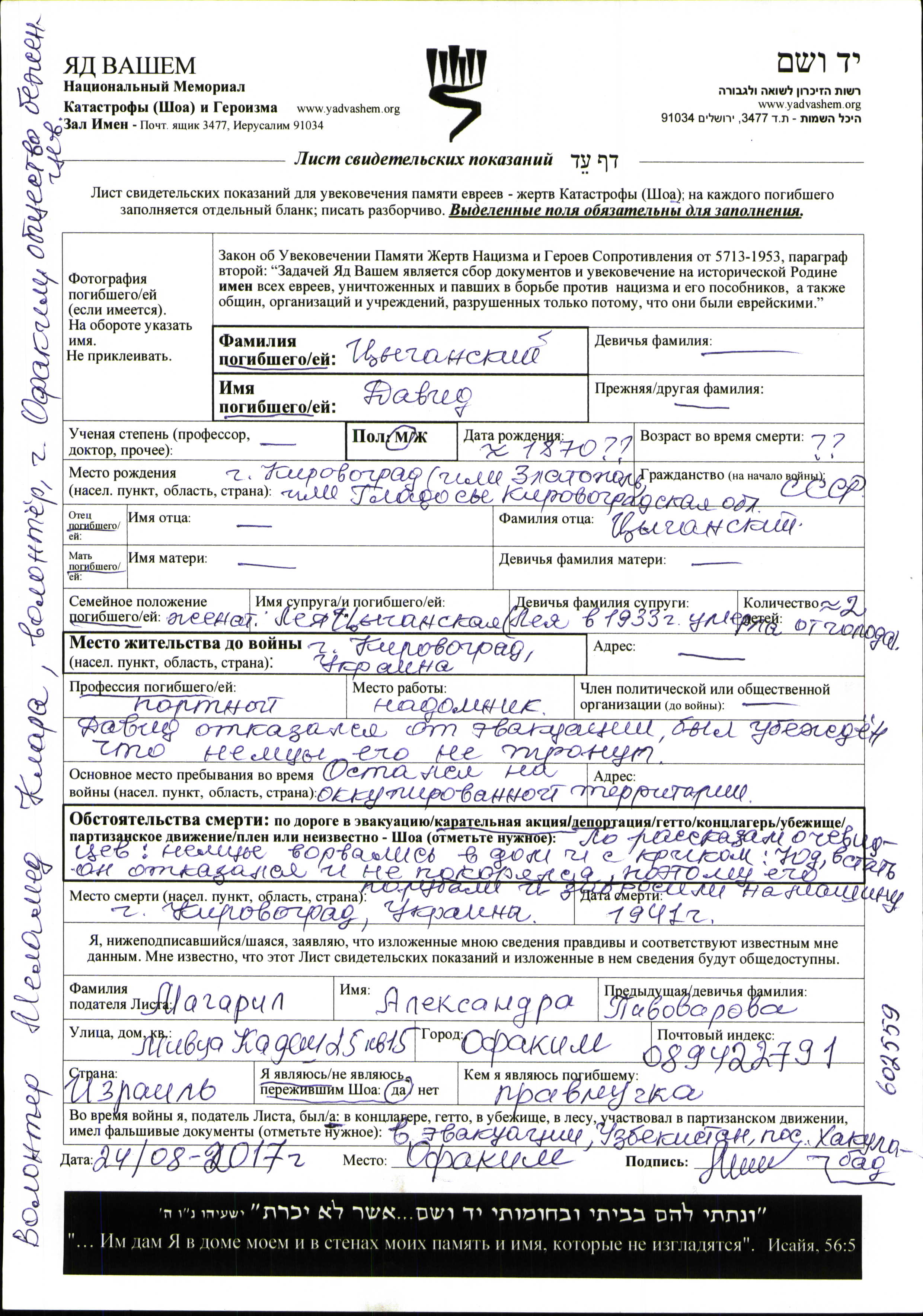 Цыганский Давид 1870 Кировоград, Украина (СССР) Лист свидетельских показаний