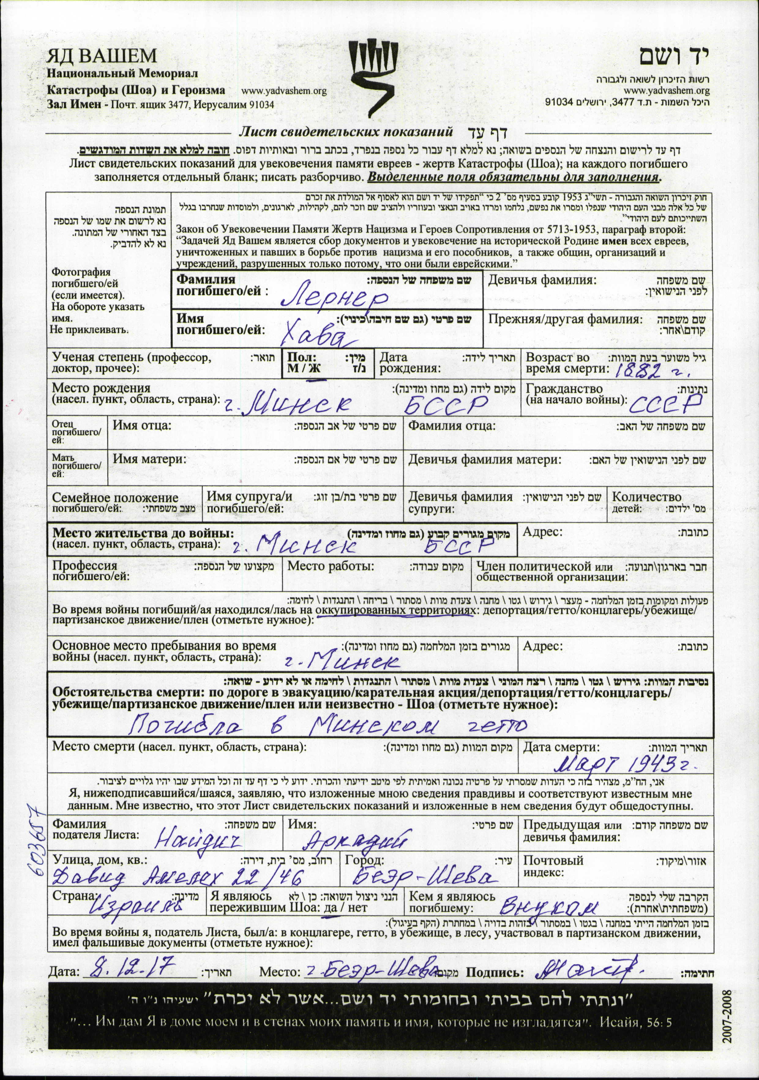 Лернер Хава 1882 Минск, Белоруссия (СССР) Лист свидетельских показаний