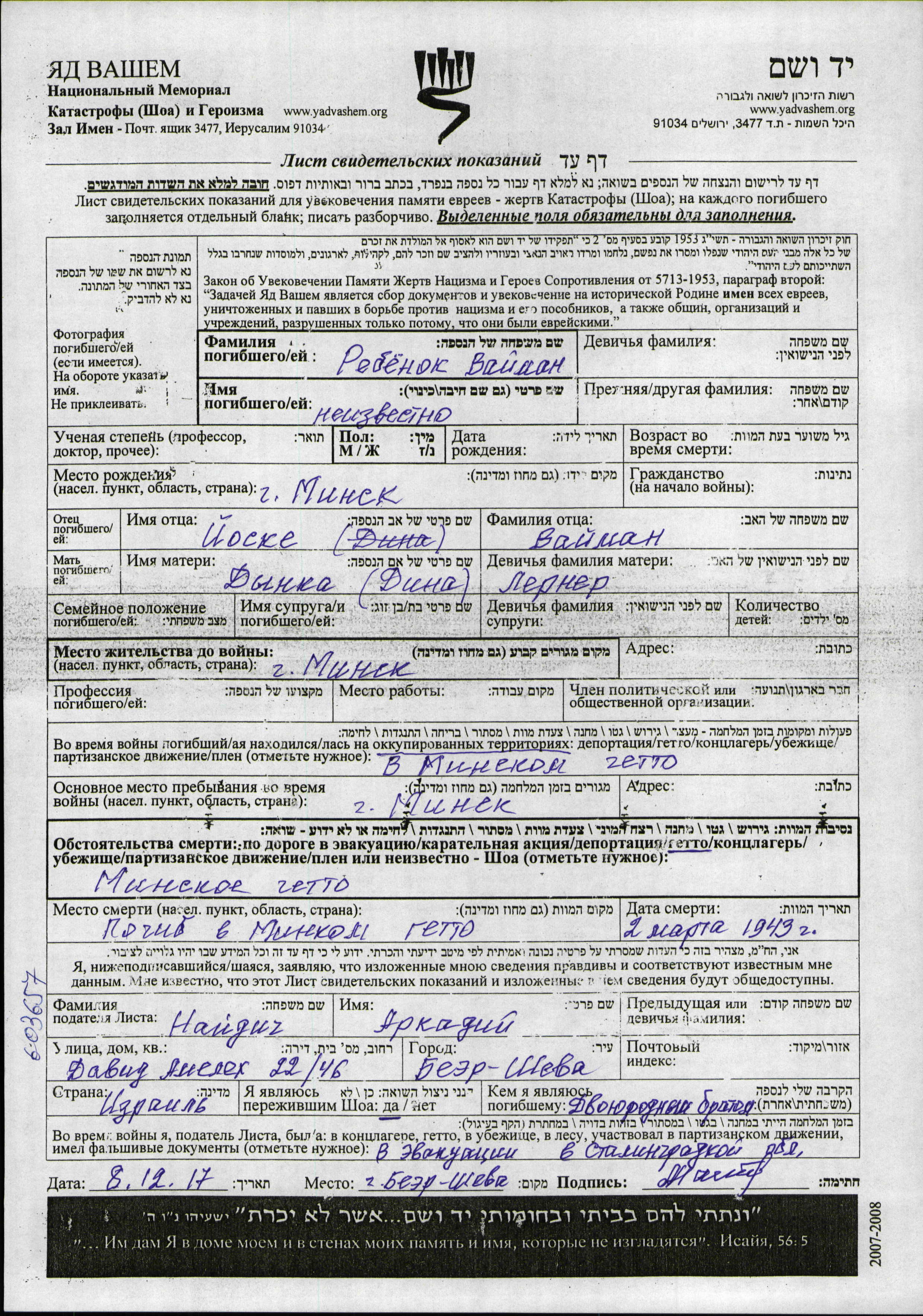 Вайман Имя неизвестно Минск, Белоруссия (СССР) Лист свидетельских показаний