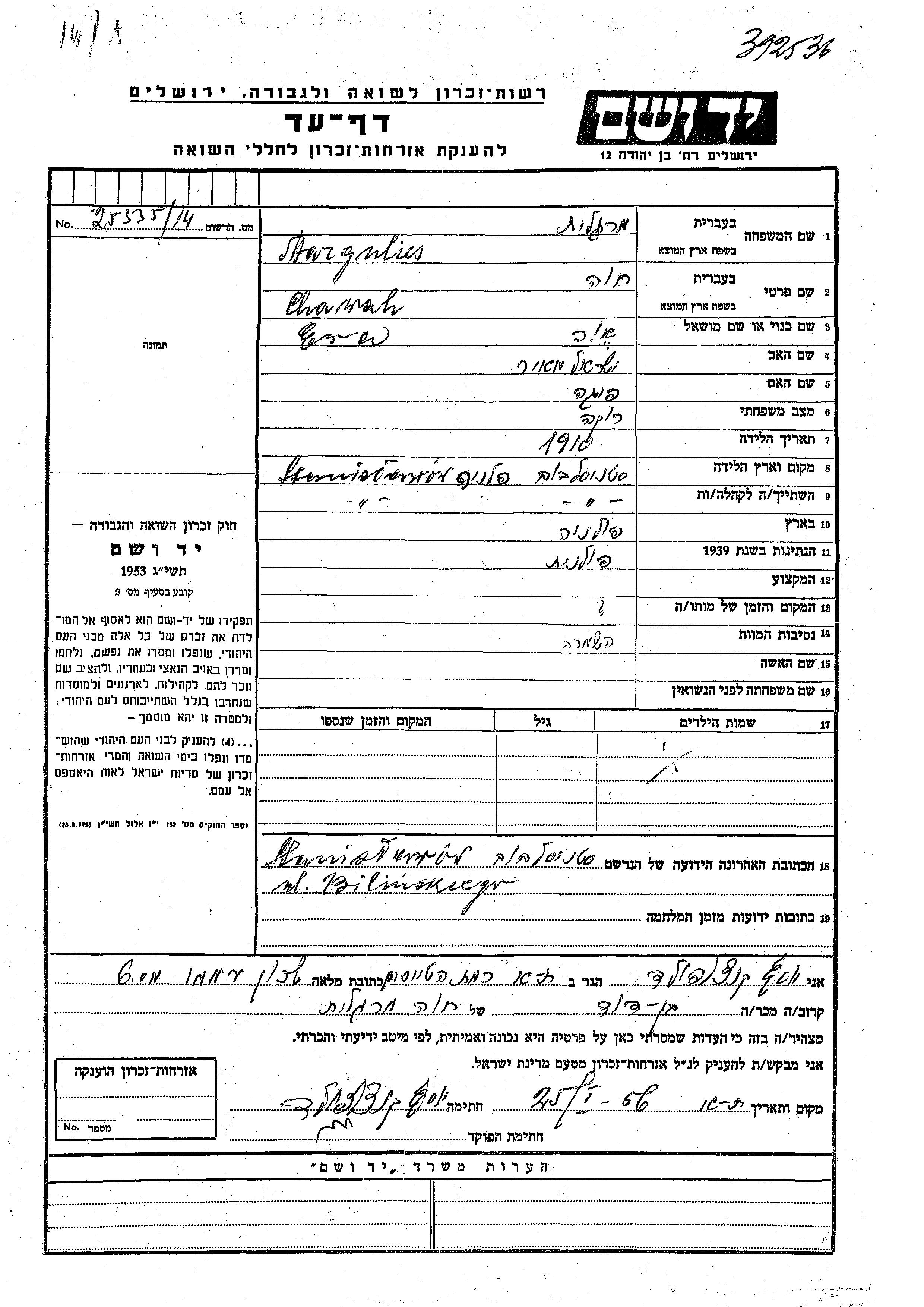 Яд Вашем - Листы свидетельских показаний Мемориального фонда