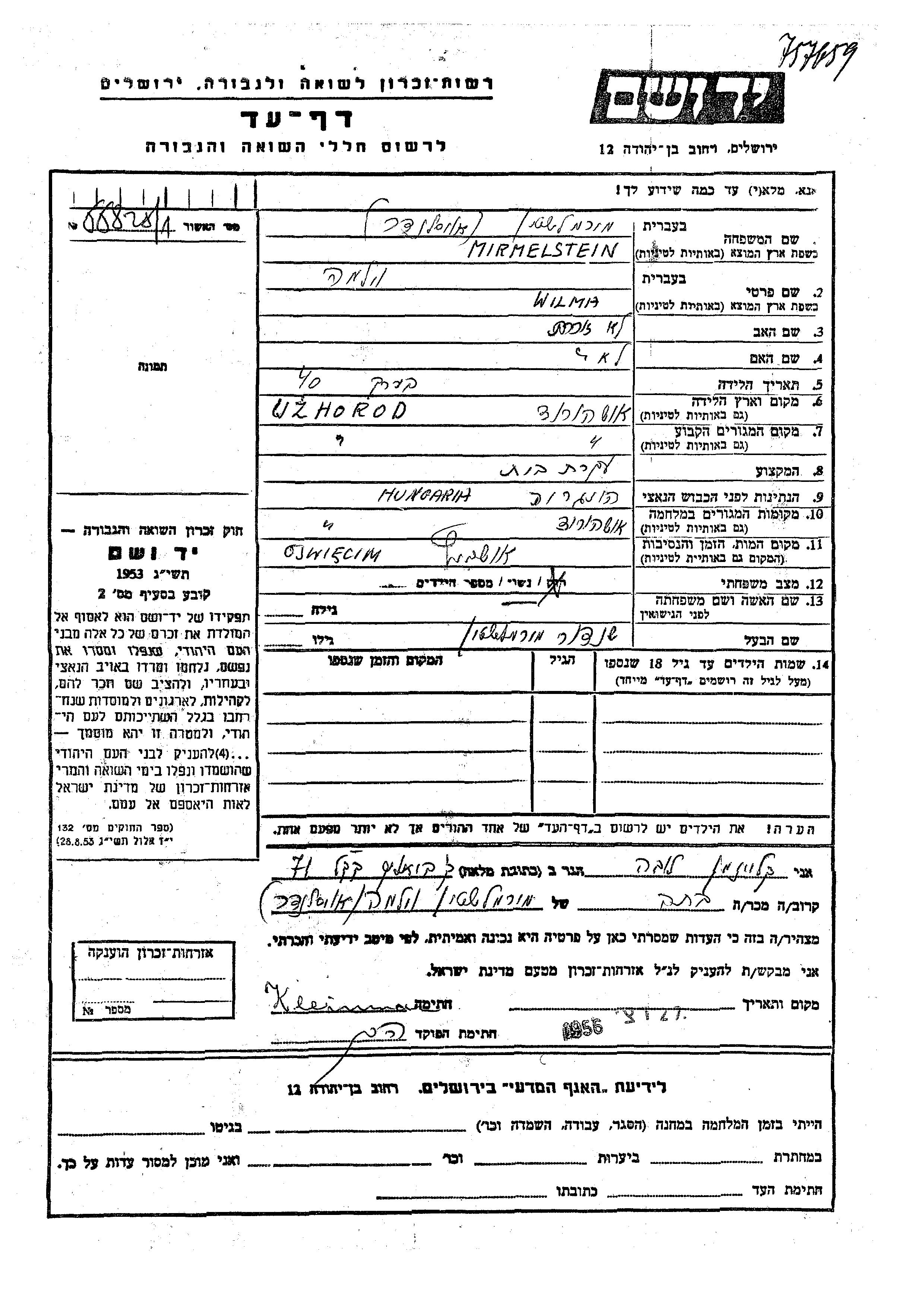 Вильма Мирмельштейн, девичья фамилия Ойслендер, место рождения: Ужгород, Чехословакия. Домохозяйка. Женат / замужем. Место жительства до войны: Ужгород, Чехословакия. Место во время войны: Ужгород, Чехословакия.