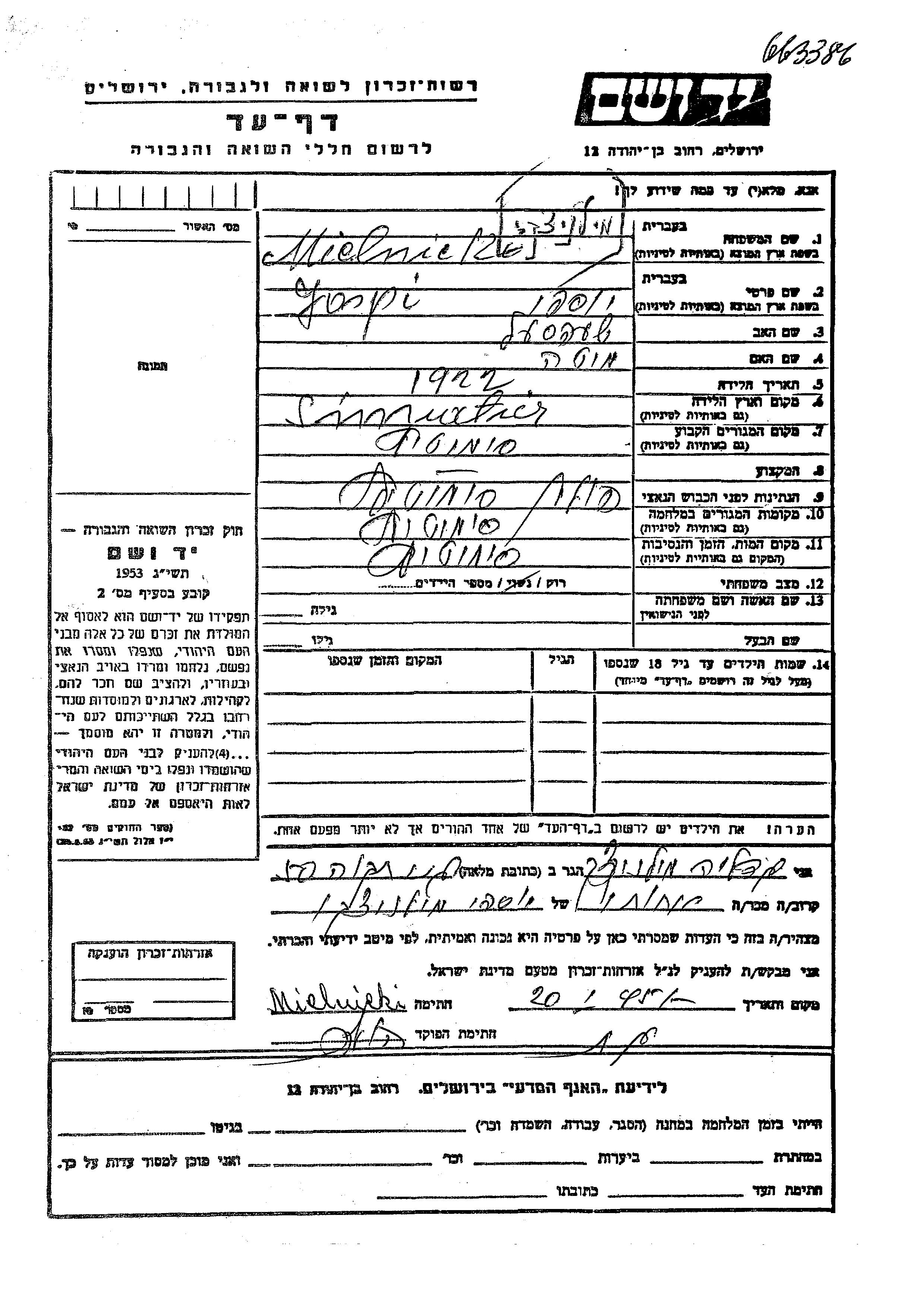 Мельницки Jospi Иосефи 1922 Семятыче, Польша Лист свидетельских показаний