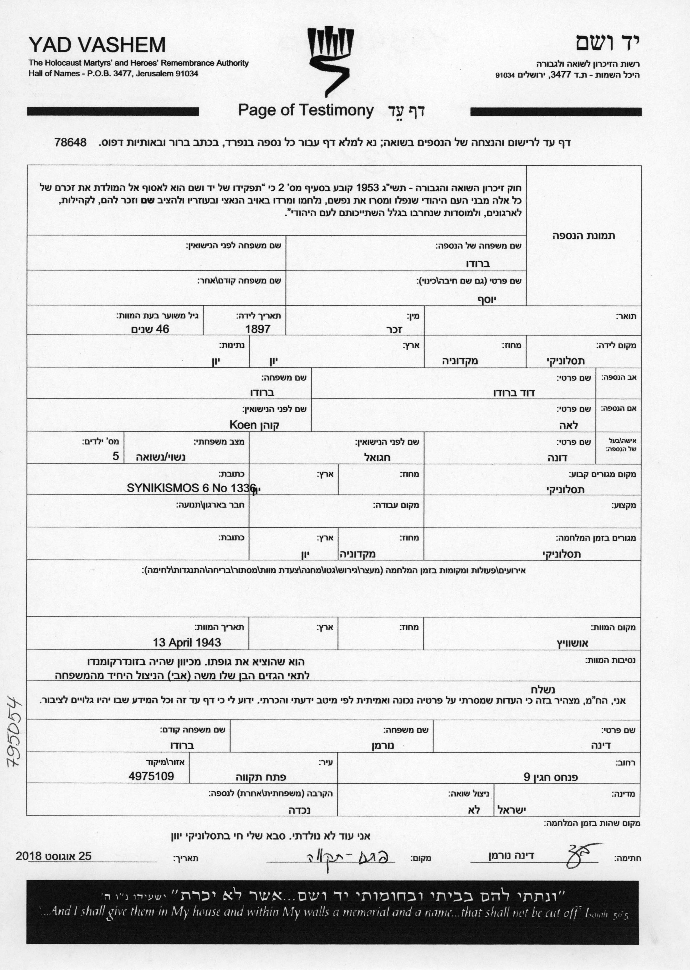 Иосеф Брудо, место рождения: Салоники, Греция. Отец: Давид, mать:Лея, девичья фамилия Коэн. Женат / замужем. Место жительства до войны: Салоники, Греция. Место во время войны: Салоники, Греция.