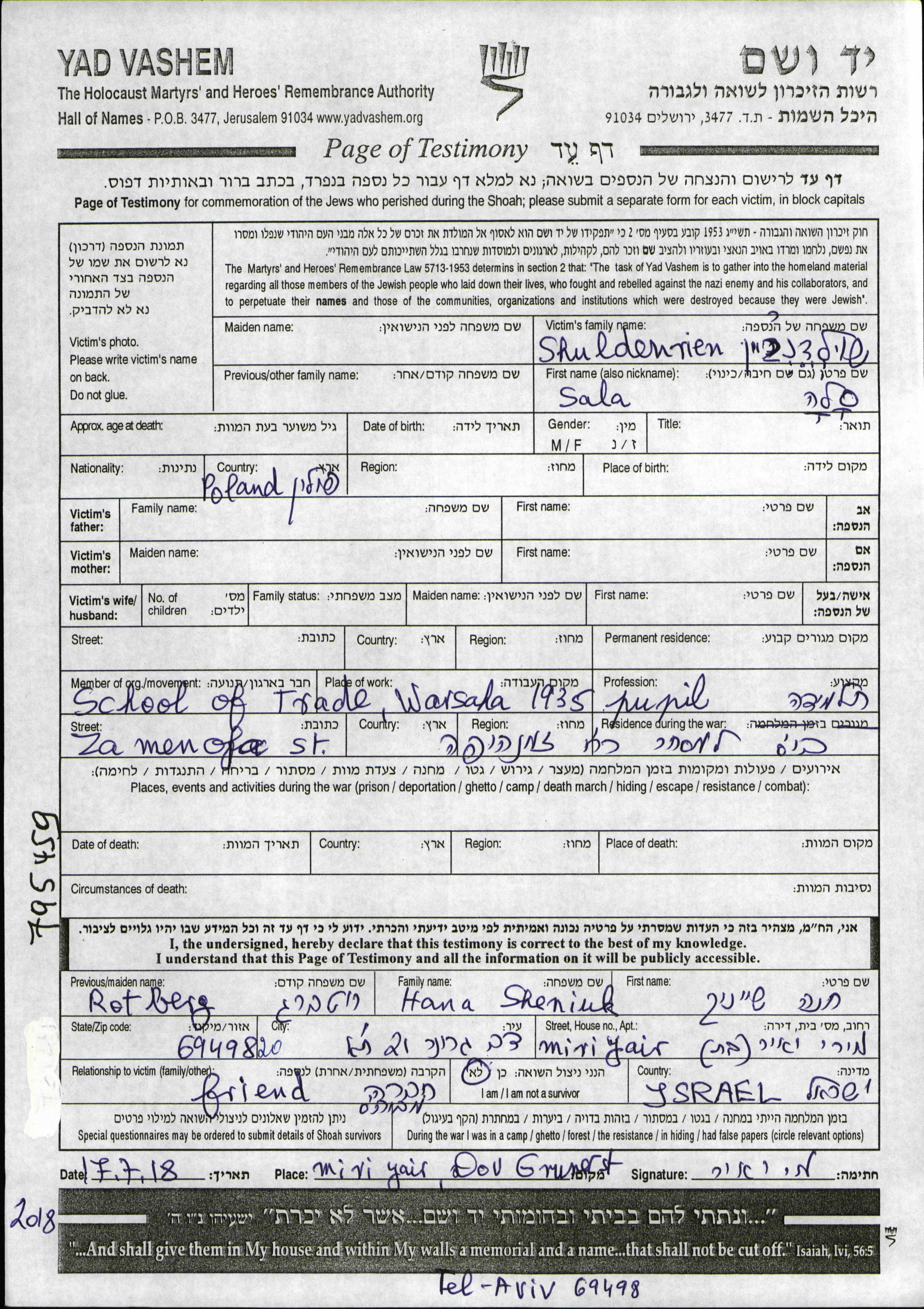Сала Шульденрейн, место рождения: Польша. Студентка коммерческого училища. Место жительства до войны: Варшава, Польша.
