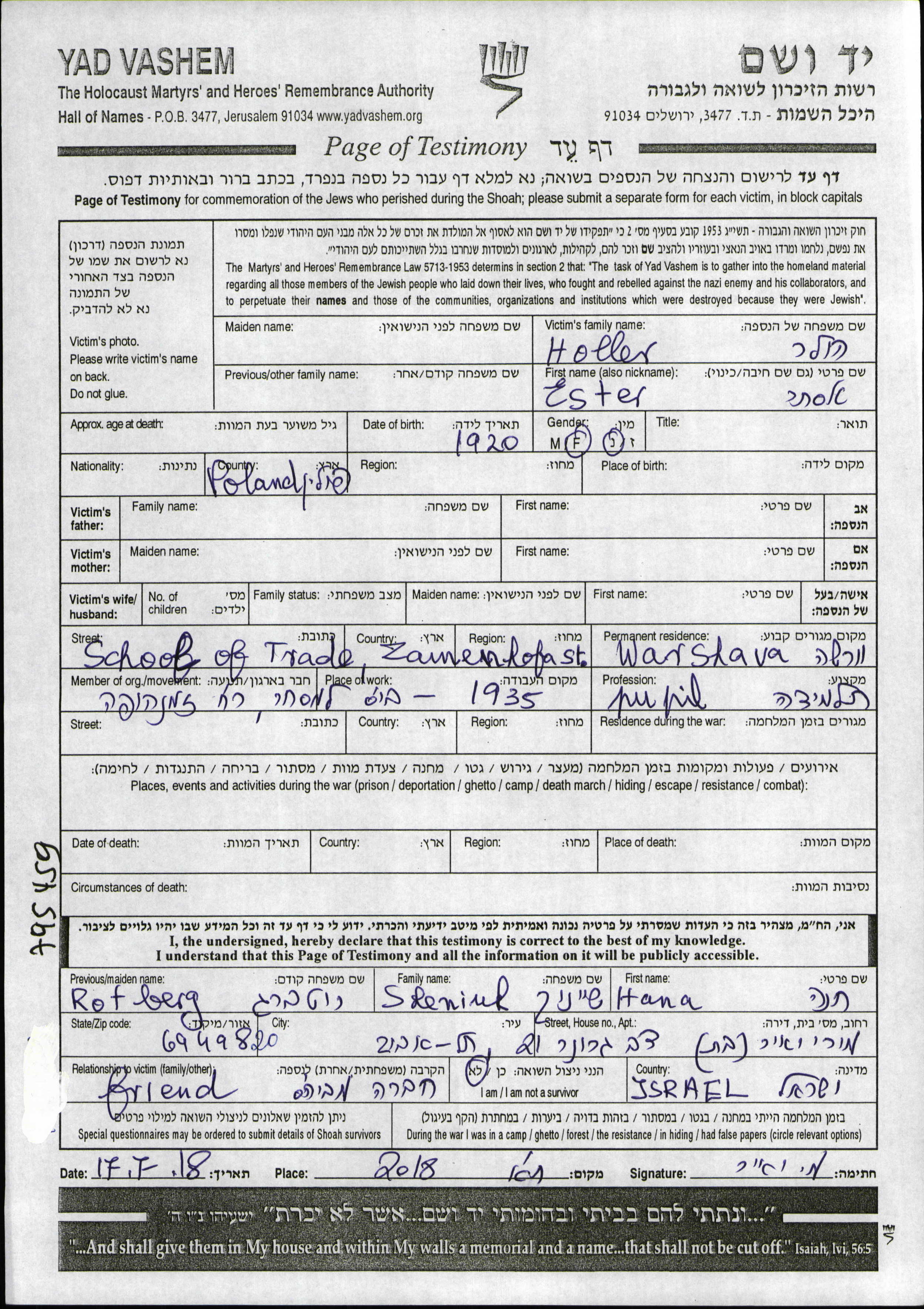 Холлер Эстер 1920 Варшава, Польша Лист свидетельских показаний
