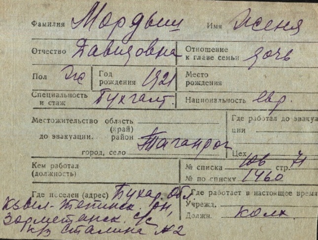 Мордиш Евгения 1920 Таганрог, Россия (СССР) Анкета для переживших Шоа, эвакуированных и беженцев