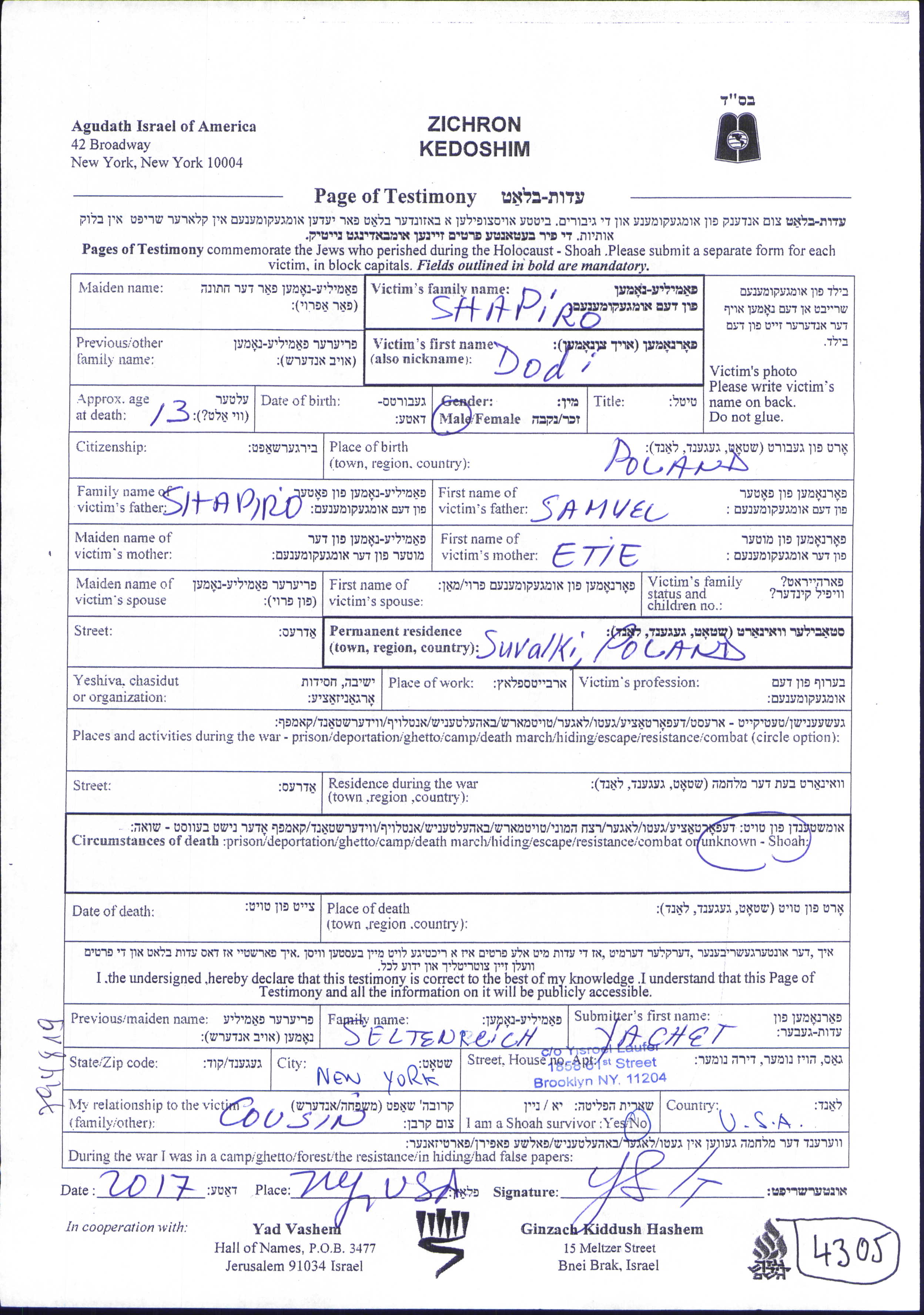 Доди Шапиро, место рождения: Польша. Отец: Самуэль, mать:Эти. Подросток. Место жительства до войны: Сувалки, Польша.