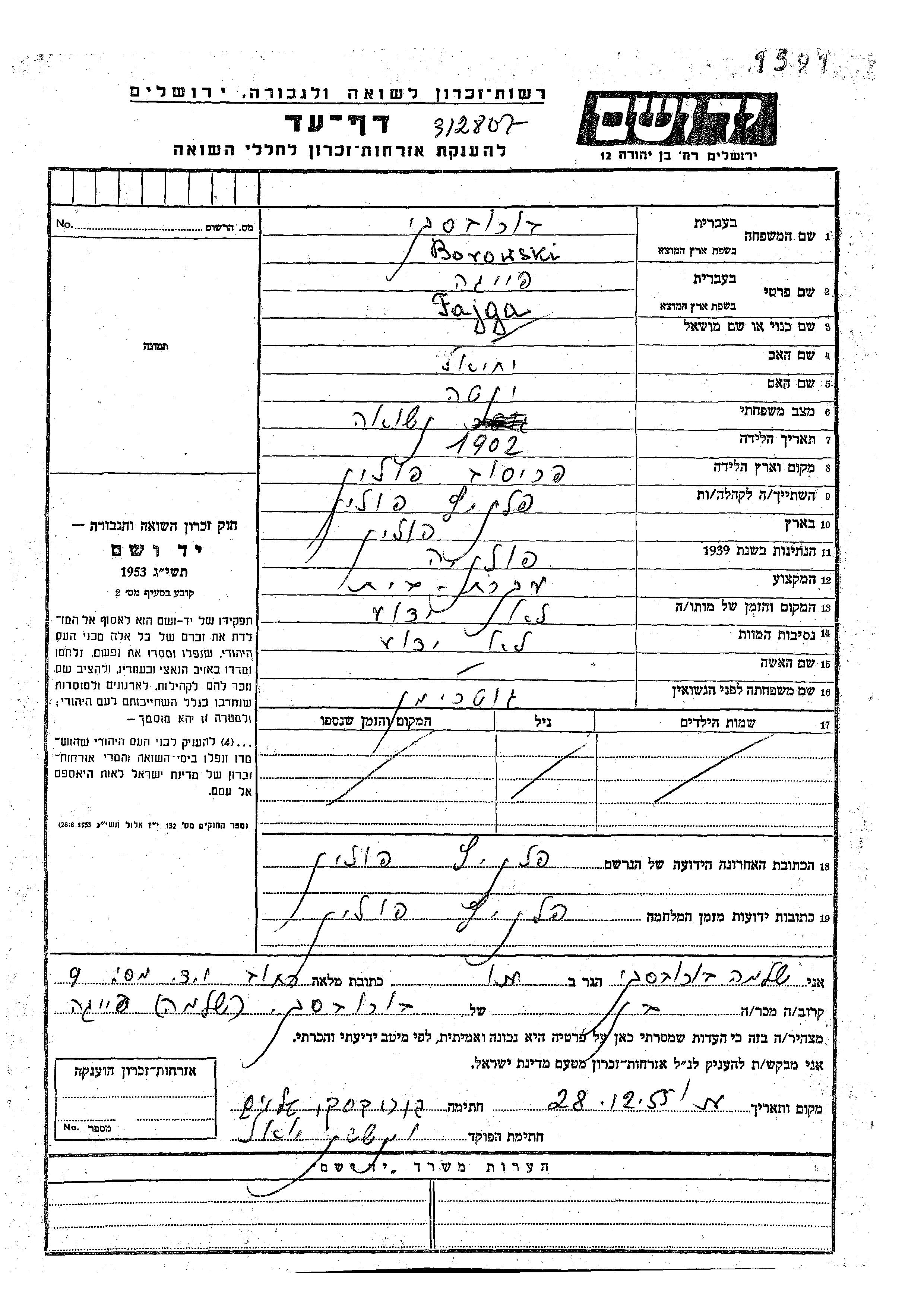 Файга Боровски, девичья фамилия Гутрейман, место рождения: Парисов, Польша. Отец: Иехиэль, mать:Ента. Домохозяйка. Женат / замужем. Место жительства до войны: Фаленица, Польша. Место во время войны: Фаленица, Польша.