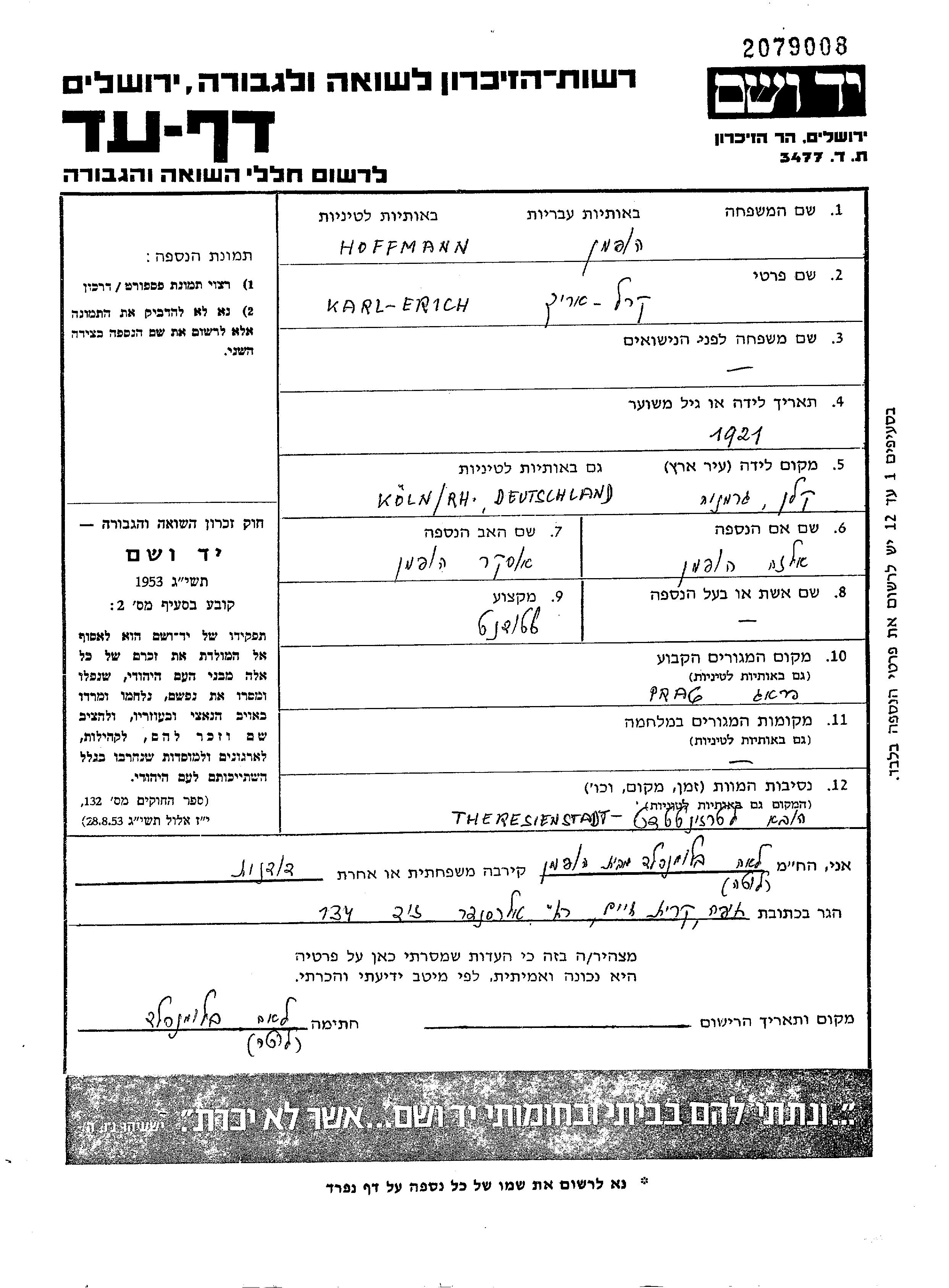 | Хоффманн | Карл Эрих | 1921 | Прага, Чехословакия | Лист свидетельских показаний |