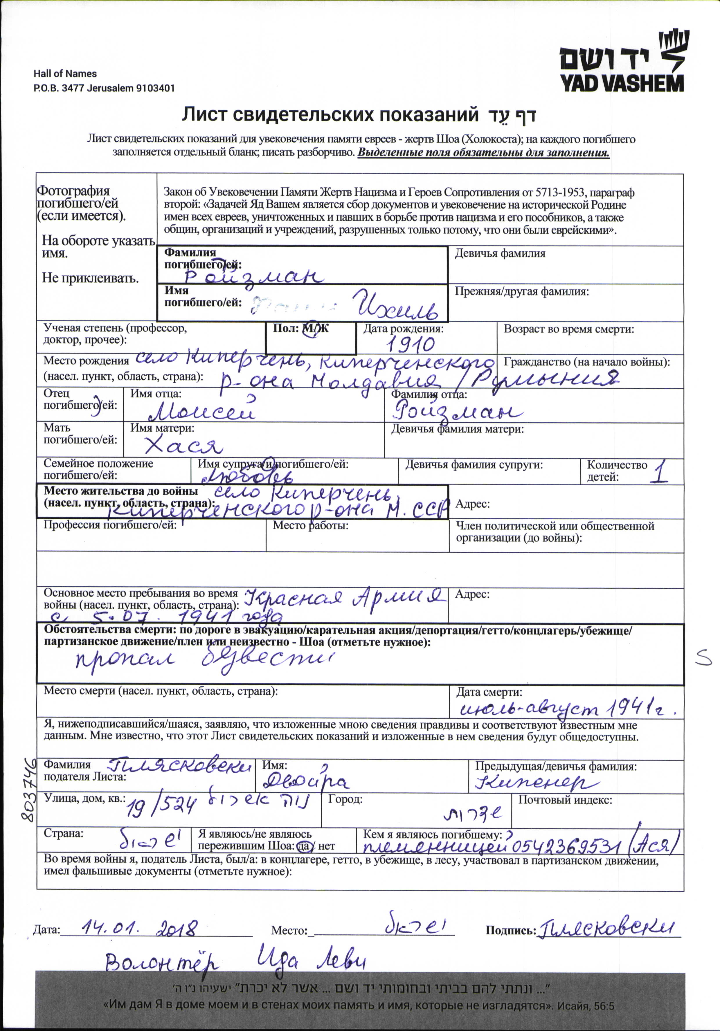 Ихил Ройзман, место рождения: Киперчень, Румыния. Отец: Моисей, mать:Хася. Женат / замужем. Место жительства до войны: Киперчень, Румыния. Место во время войны: Вооруженные силы Советского Союза. Ихил уничтожен в период Шоа. место смерти: СССР в 07/1941.