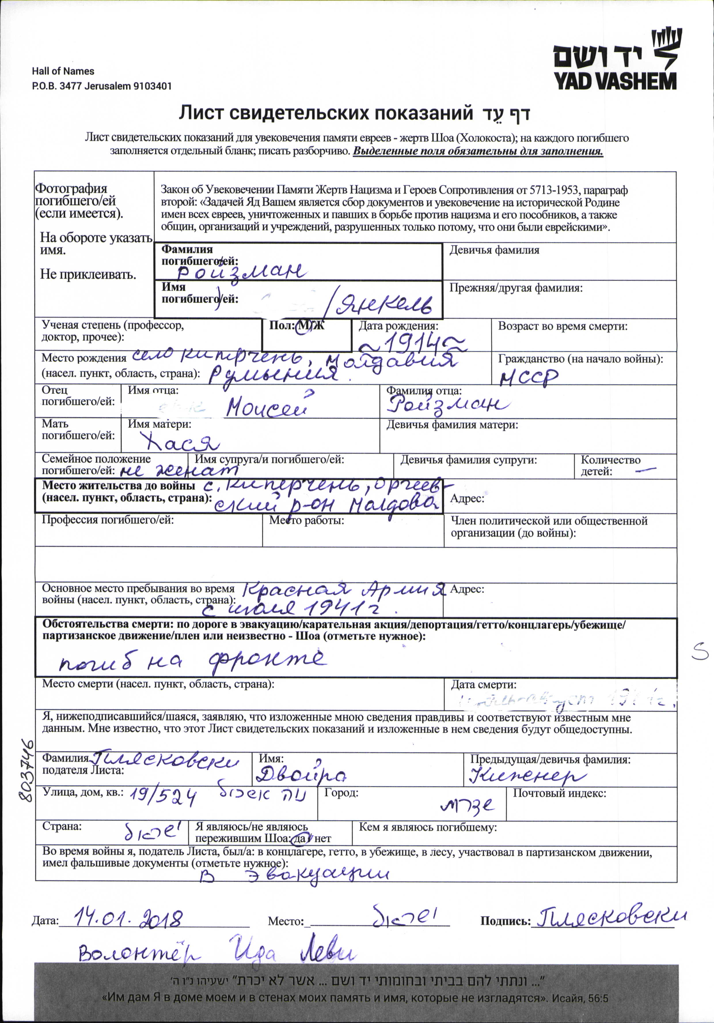 Янкель Ройзман, место рождения: Киперчень, Румыния. Отец: Моисей, mать:Хася. Холост / не замужем. Место жительства до войны: Киперчень, Румыния. Место во время войны: Вооруженные силы Советского Союза. Янкель погиб на военной службе.
