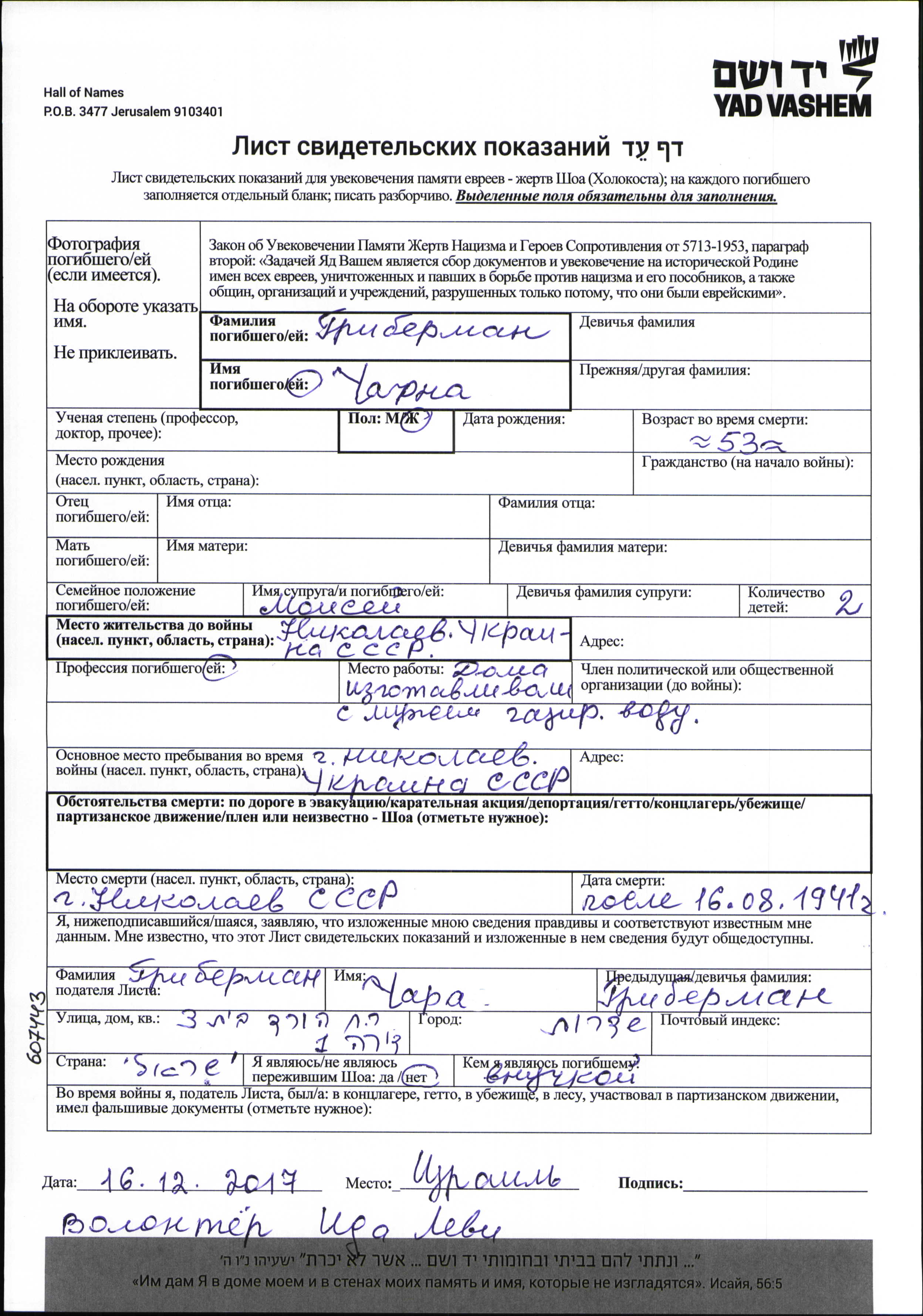Гриберман Чарна 1888 Николаев, Украина (СССР) Лист свидетельских показаний