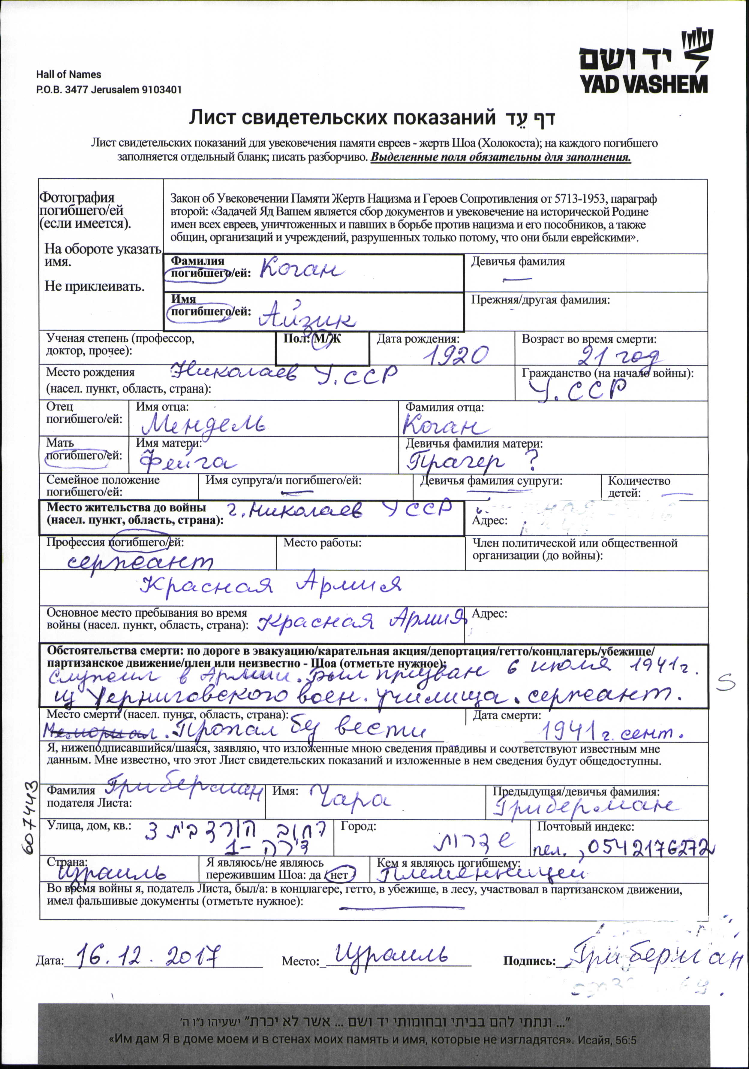 Коган Айзик 1920 Николаев, Украина (СССР) Лист свидетельских показаний