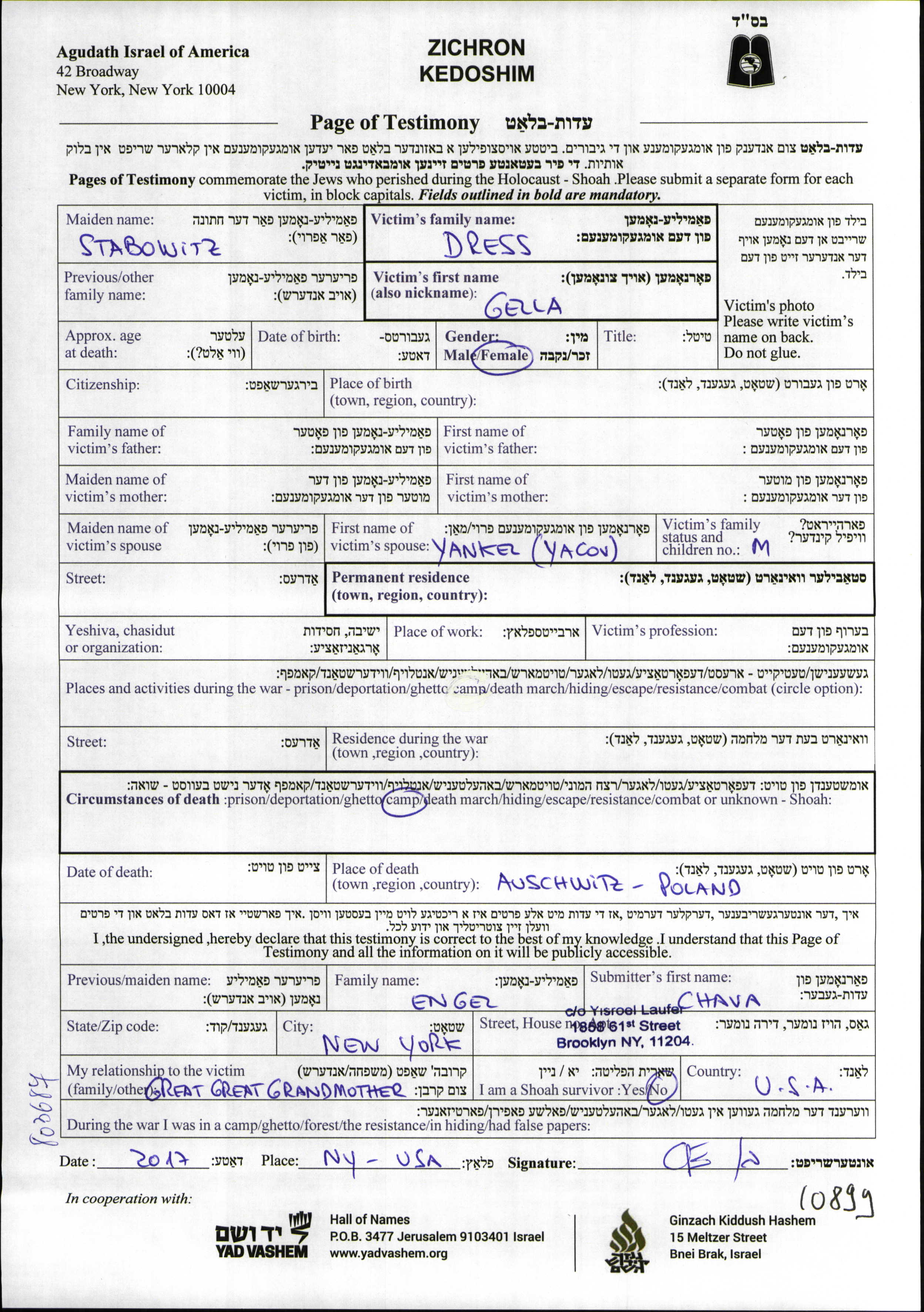 Гелла уничтоженa в период Шоа. место смерти: Аушвиц, Польша.