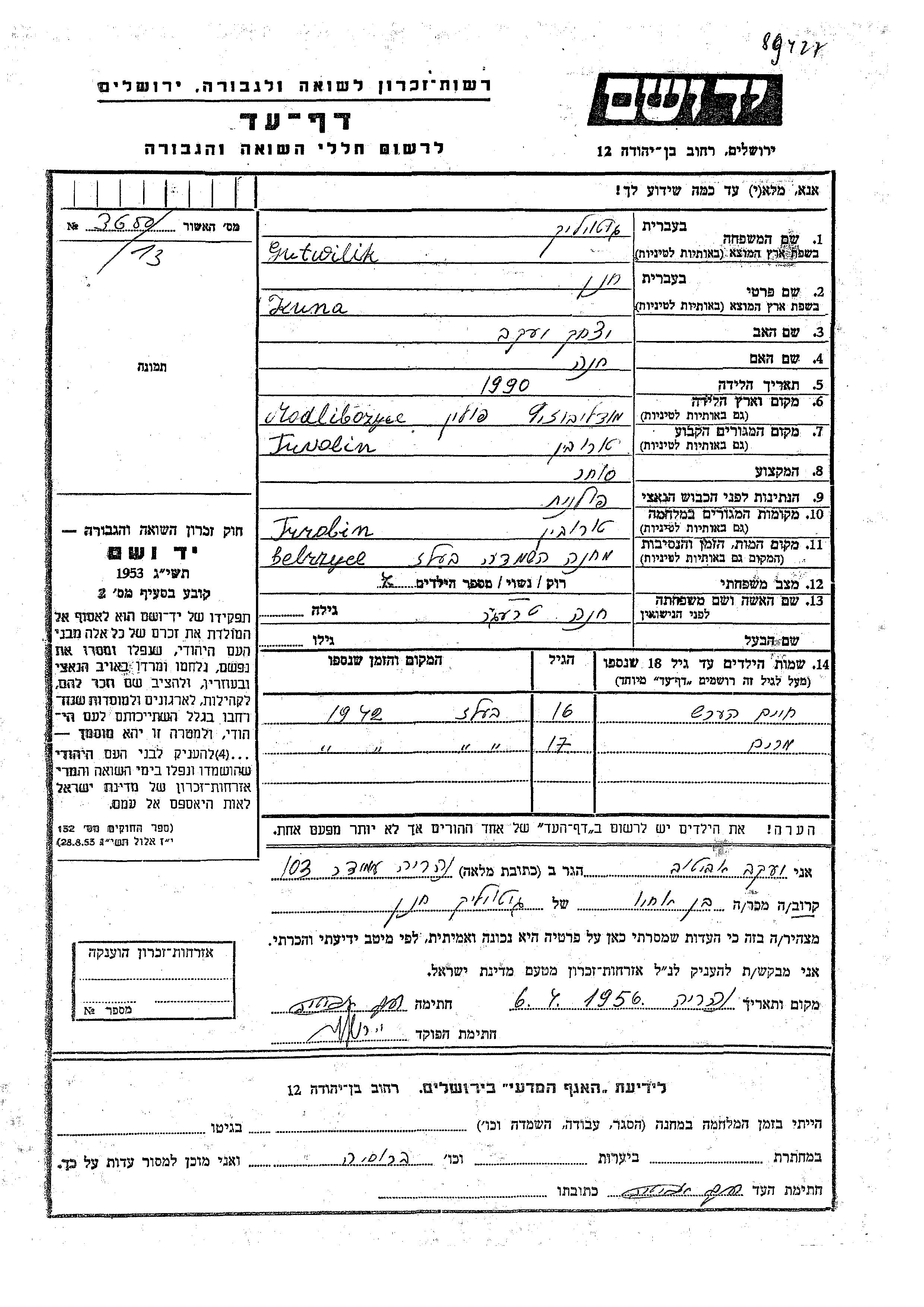 Хуна Гутвилик, место рождения: Модлибожице, Польша. Отец: Ицхак Яков, mать:Хана. Торговец / торговка. Женат / замужем. Место жительства до войны: Туробин, Польша. Место во время войны: Туробин, Польша.
