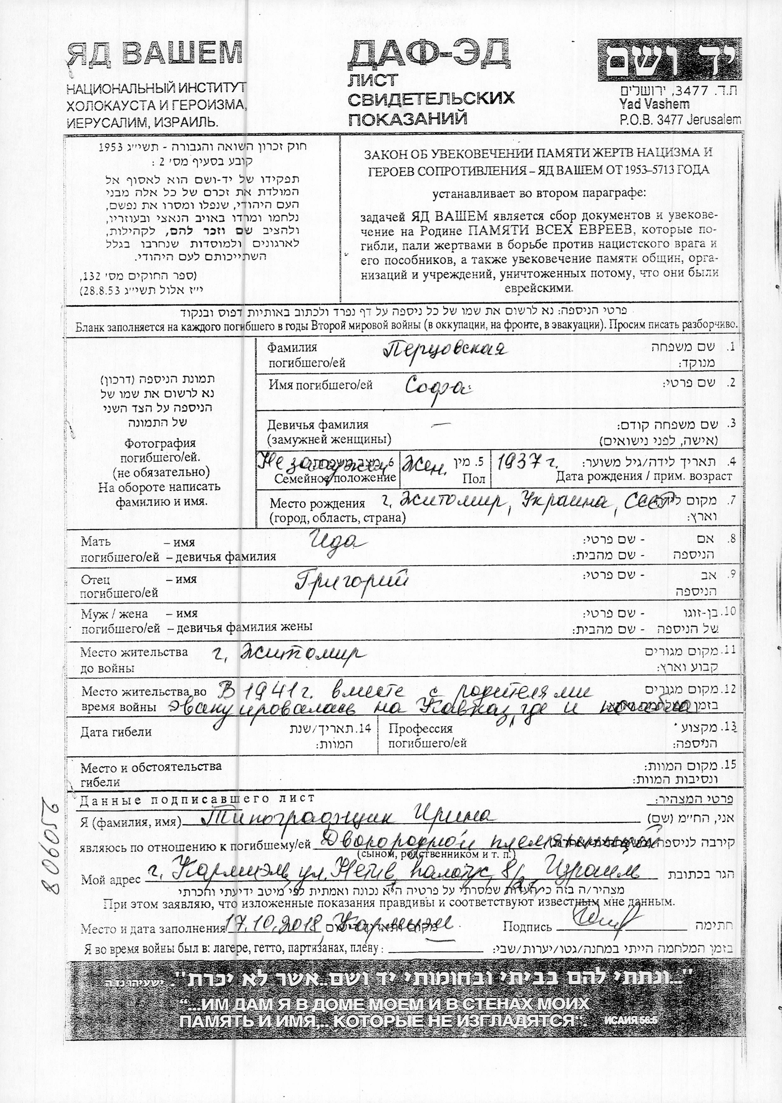 Перцовская Софа 1937 Житомир, Украина (СССР) Лист свидетельских показаний