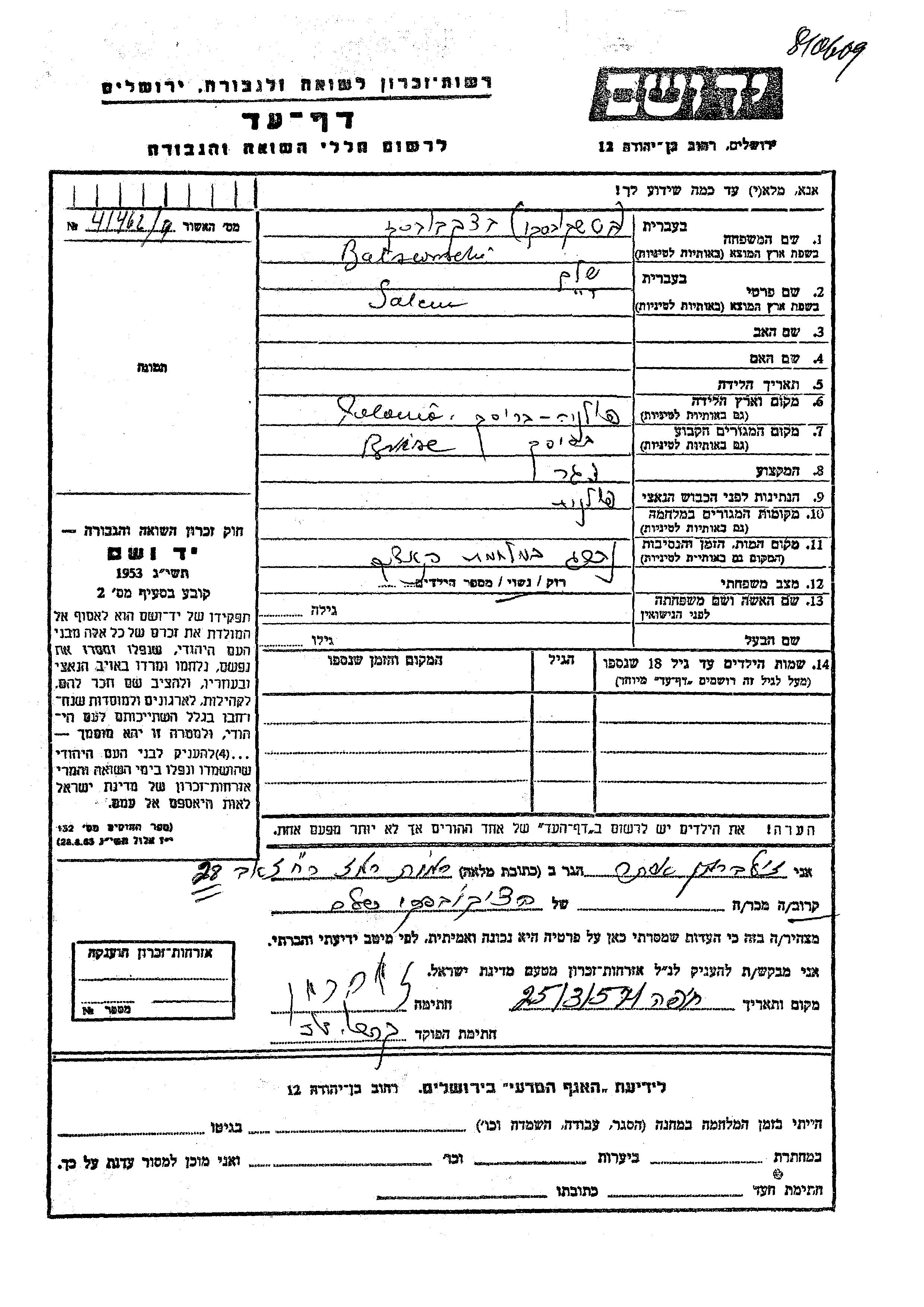 Салем Бацковски, место рождения: Бриск, Польша. Столяр / плотник. Женат / замужем. Место жительства до войны: Бриск, Польша.