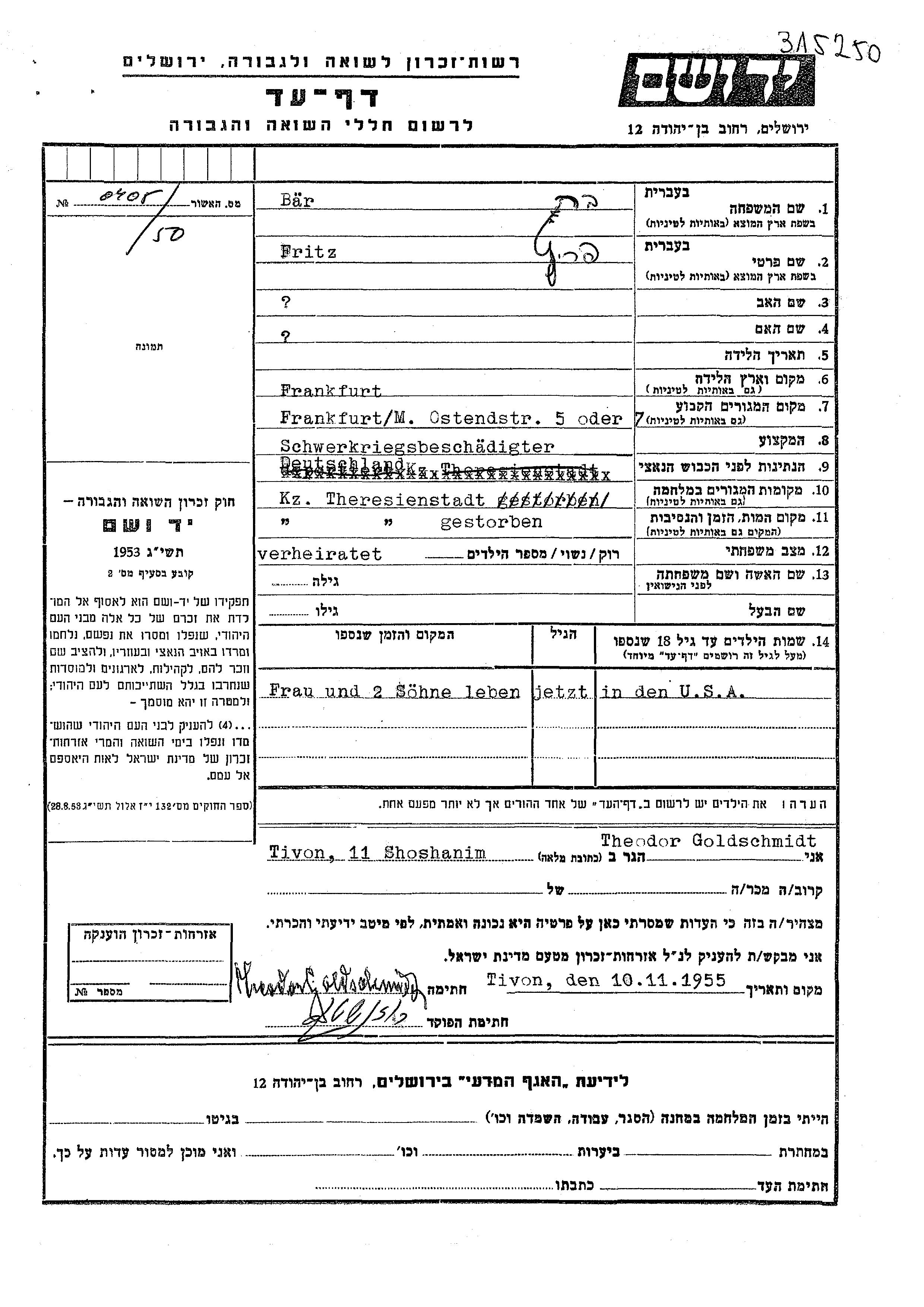 Фриц Бер, место рождения: Франкфурт-на-Майне, Германия. Инвалид войны. Женат / замужем. Место жительства до войны: Франкфурт-на-Майне, Германия. Место во время войны: Терезиенштадт, Чехословакия.
