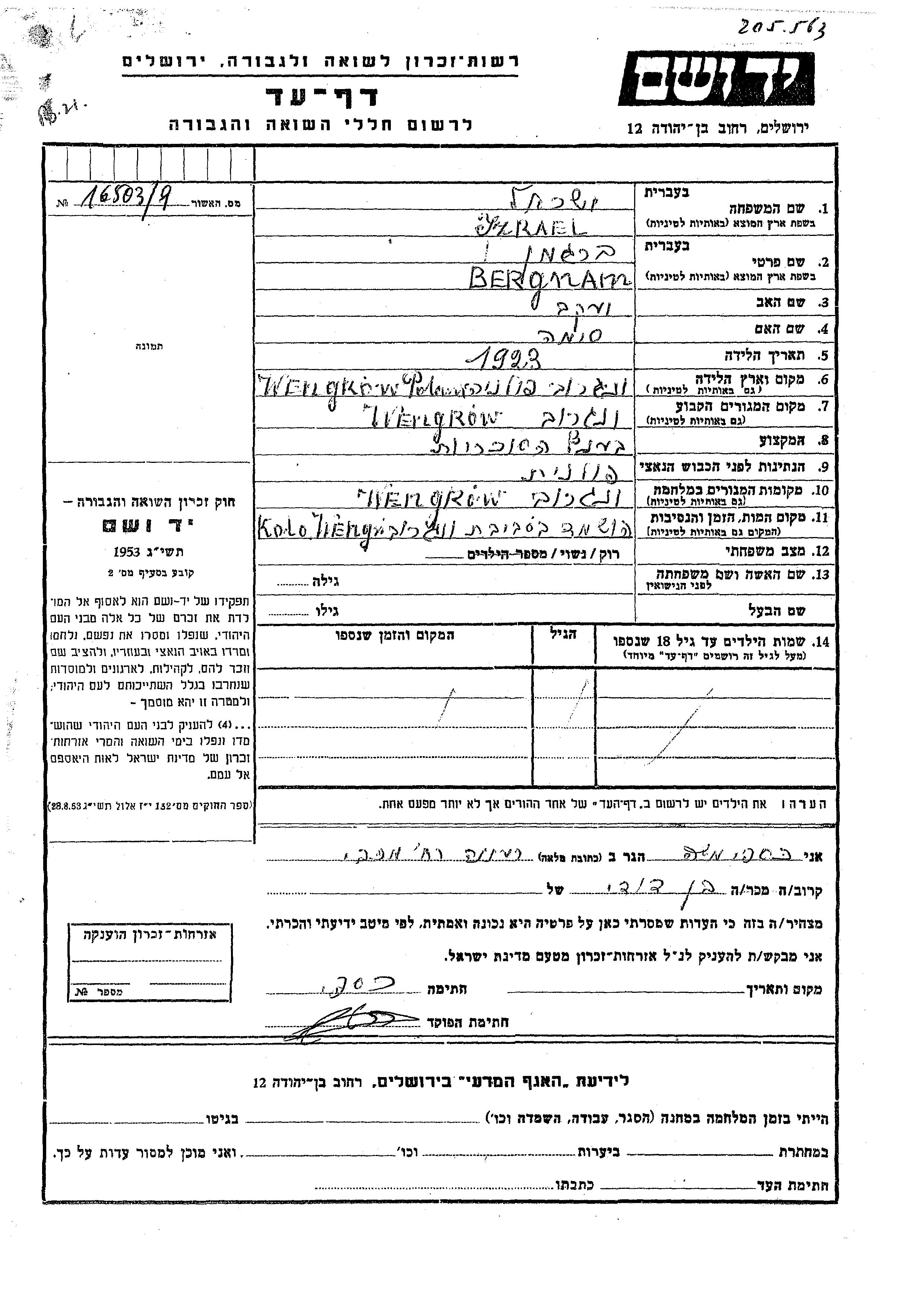 Израэль Бергман, место рождения: Венгрув, Польша. Отец: Яков, mать:Сима. Торговец / торговка. Холост / не замужем. Место жительства до войны: Венгрув, Польша. Место во время войны: Венгрув, Польша.