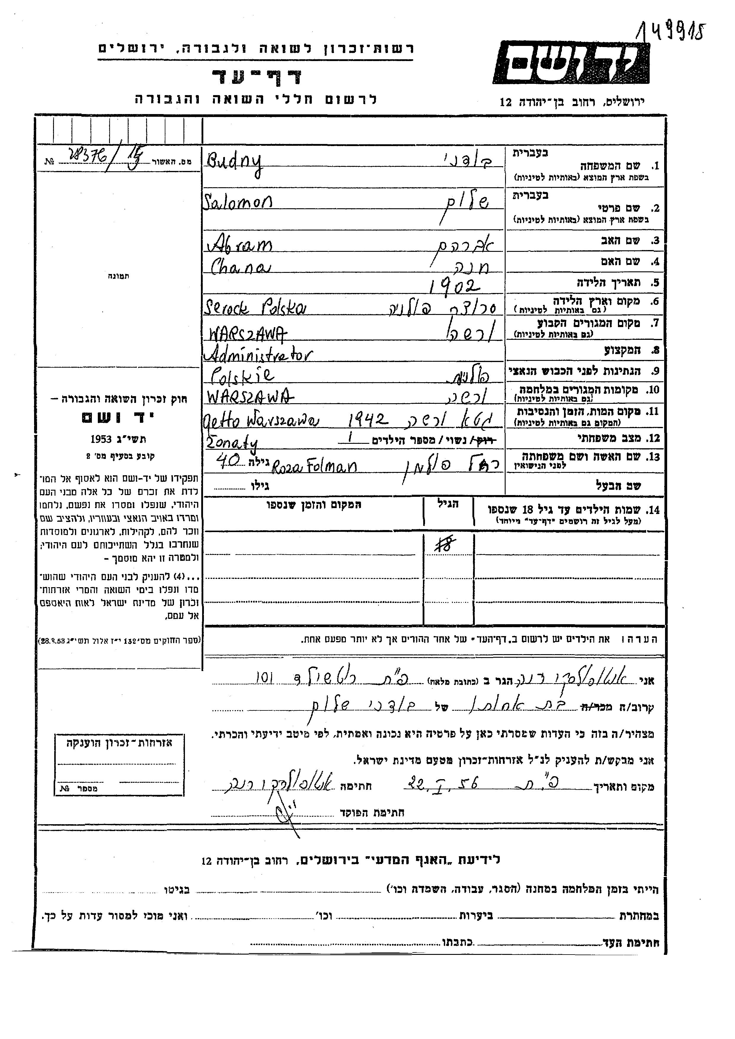 Саломон Шалом Будны, место рождения: Сероцк, Польша. Отец: Абрам, mать:Хана. Администратор. Женат / замужем. Место жительства до войны: Варшава, Польша. Место во время войны: Варшава, Польша.