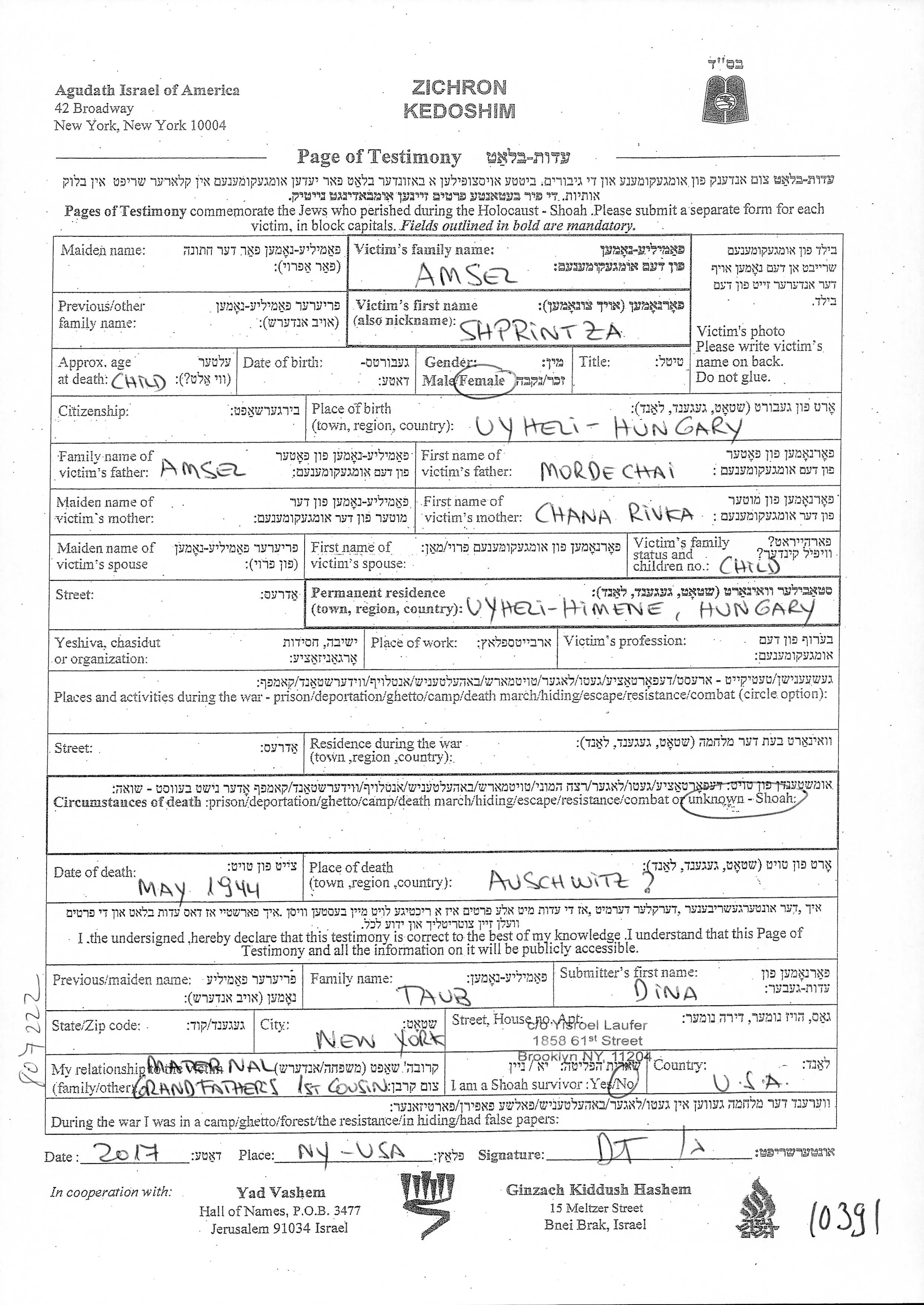 Шпринца Амсел, место рождения: Шаторальяуйхей, Венгрия. Отец: Мордехай, mать:Хана Ривка. Ребенок. Место жительства до войны: Шаторальяуйхей, Венгрия.
