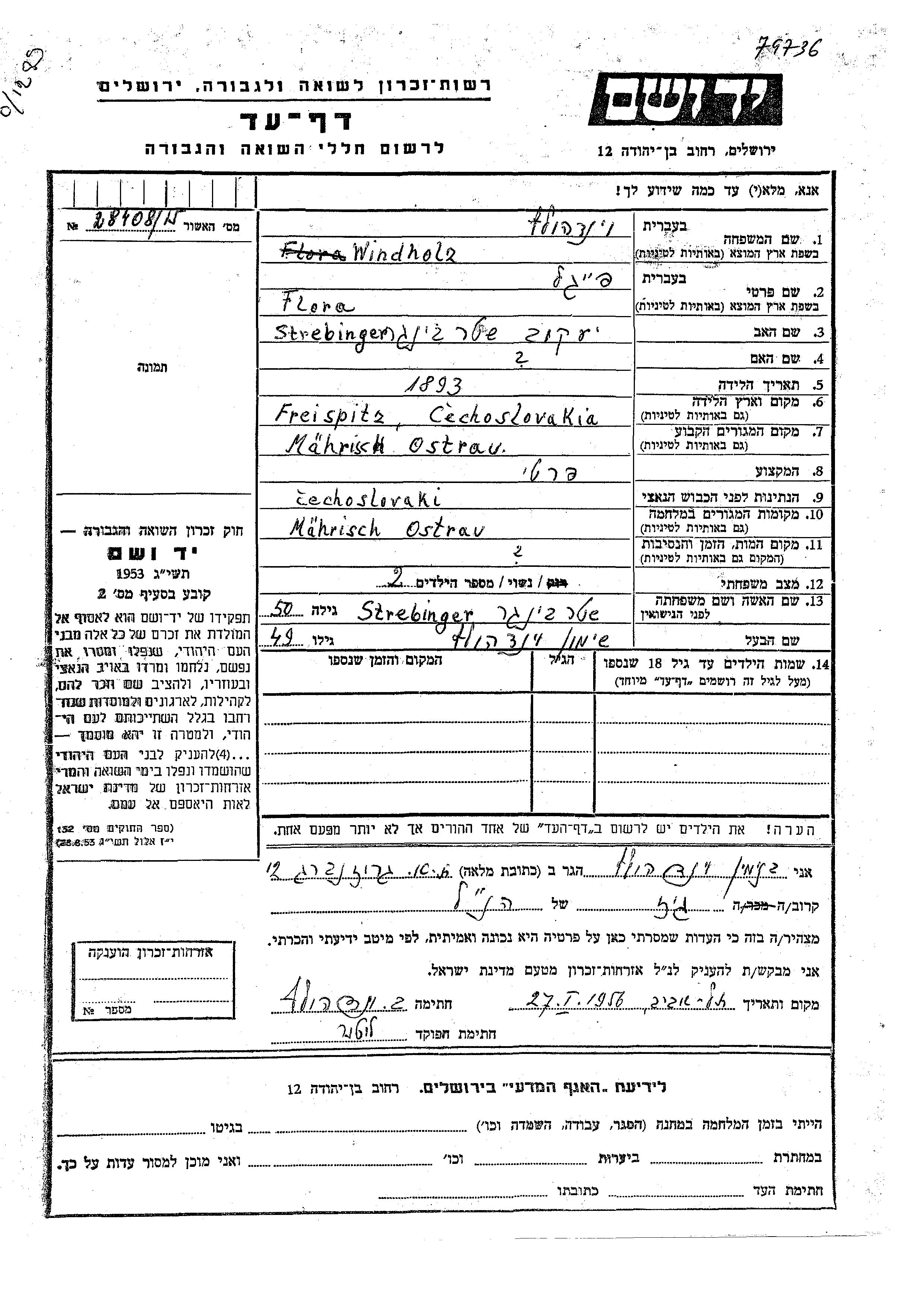 Флора Файгель Виндхольц, девичья фамилия Штребингер, место рождения: Фрайншпиц, Чехословакия. Отец: Яков. Частный предприниматель. Женат / замужем. Место жительства до войны: Мериш-Острау, Чехословакия. Место во время войны: Мериш-Острау, Чехословакия.