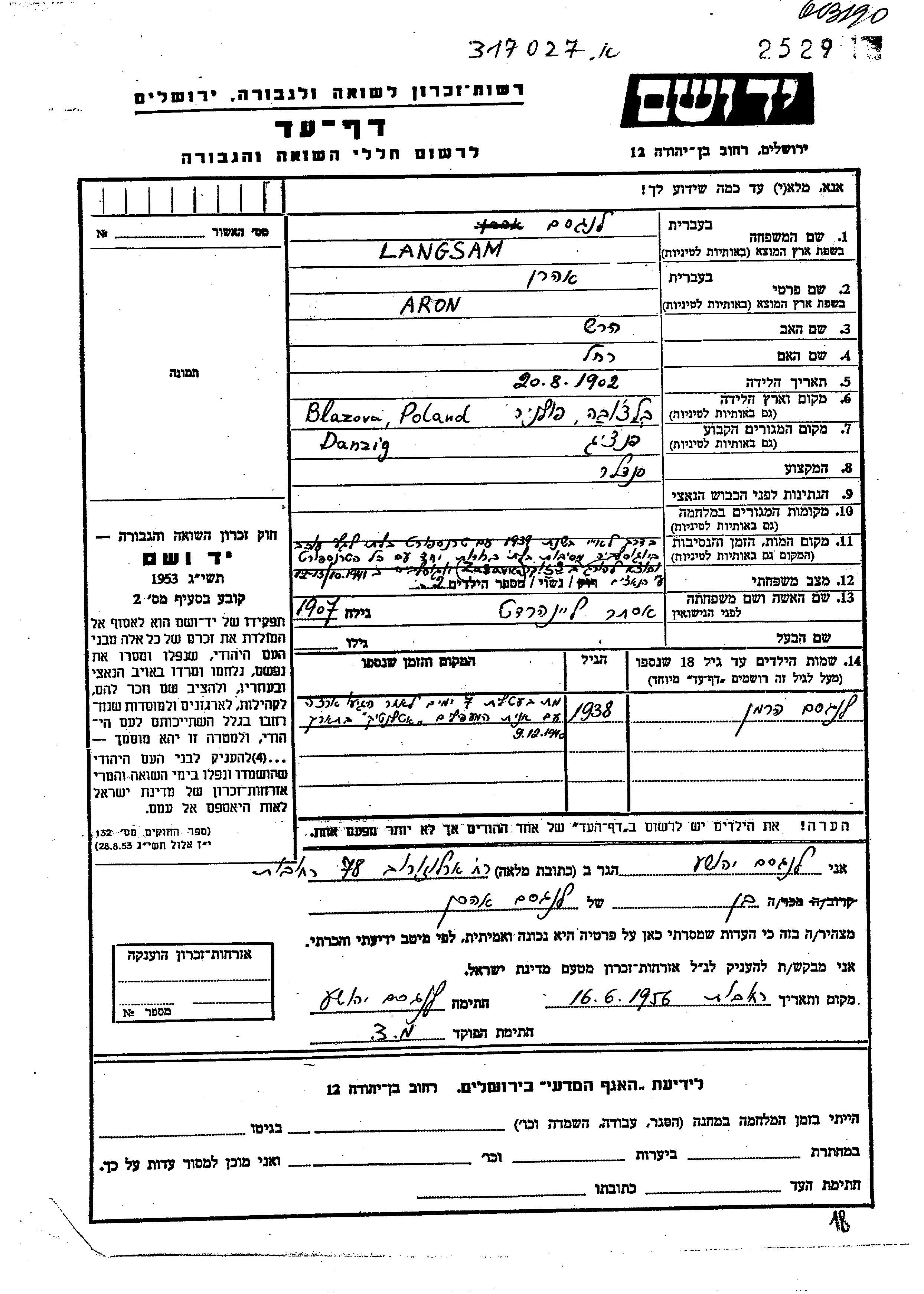 Лангзам Арон 1902 Данциг, Данциг Лист свидетельских показаний