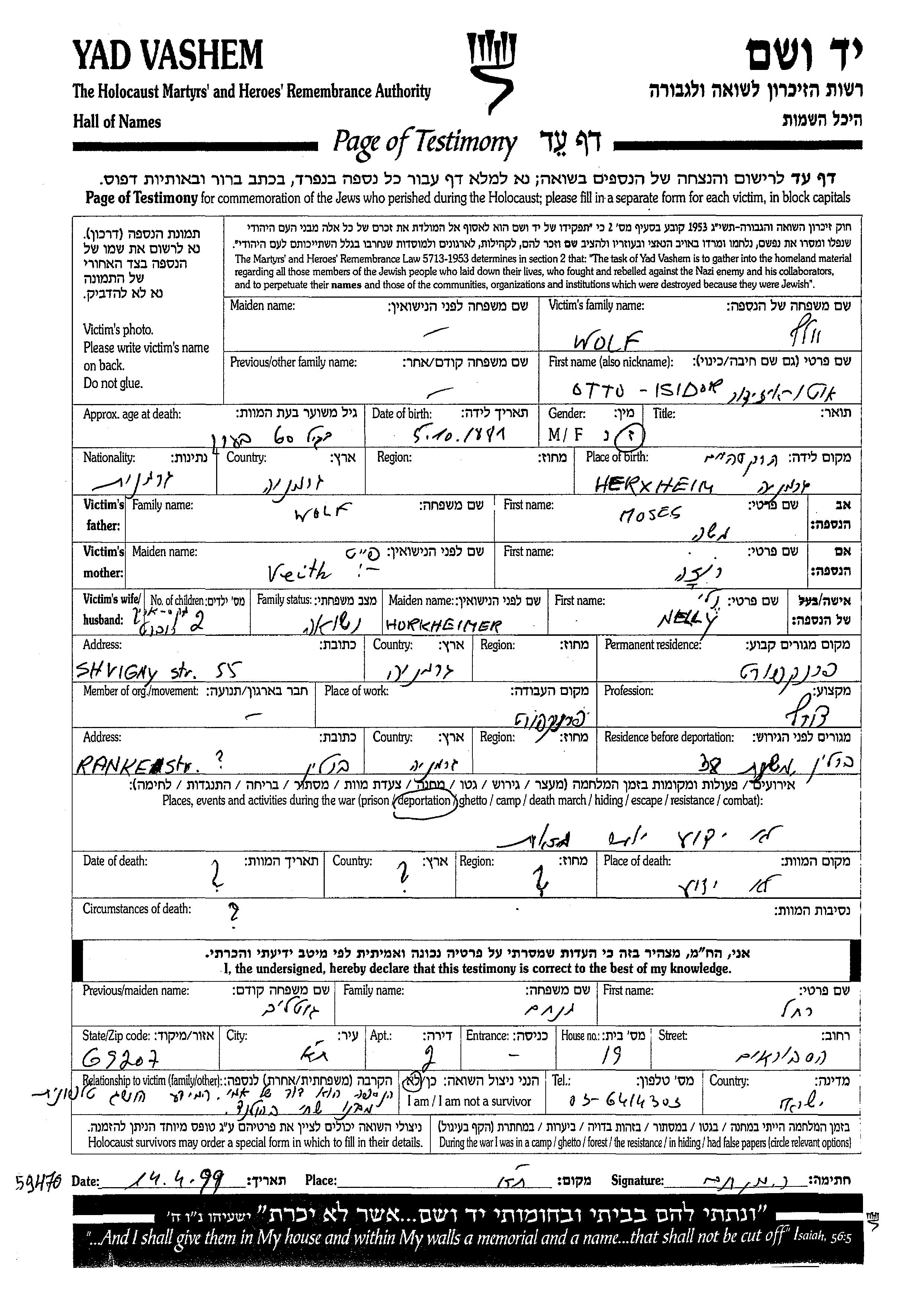 | Вольф | Отто Исидор | 1881 | Франкфурт-на-Майне, Германия | Лист свидетельских показаний |