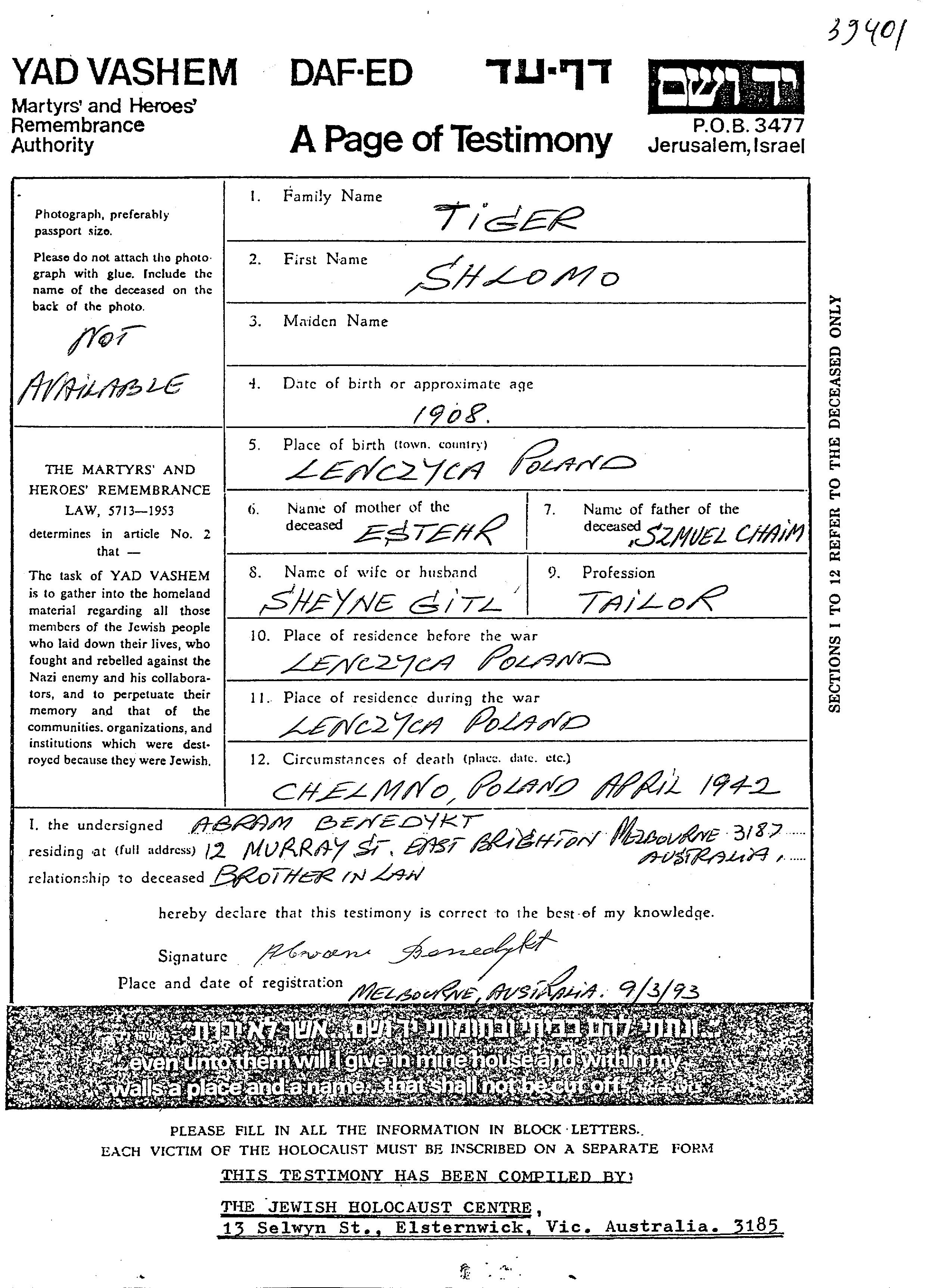 Тигер | Шломо | 1908 | Ленчица, Польша | Лист свидетельских показаний |