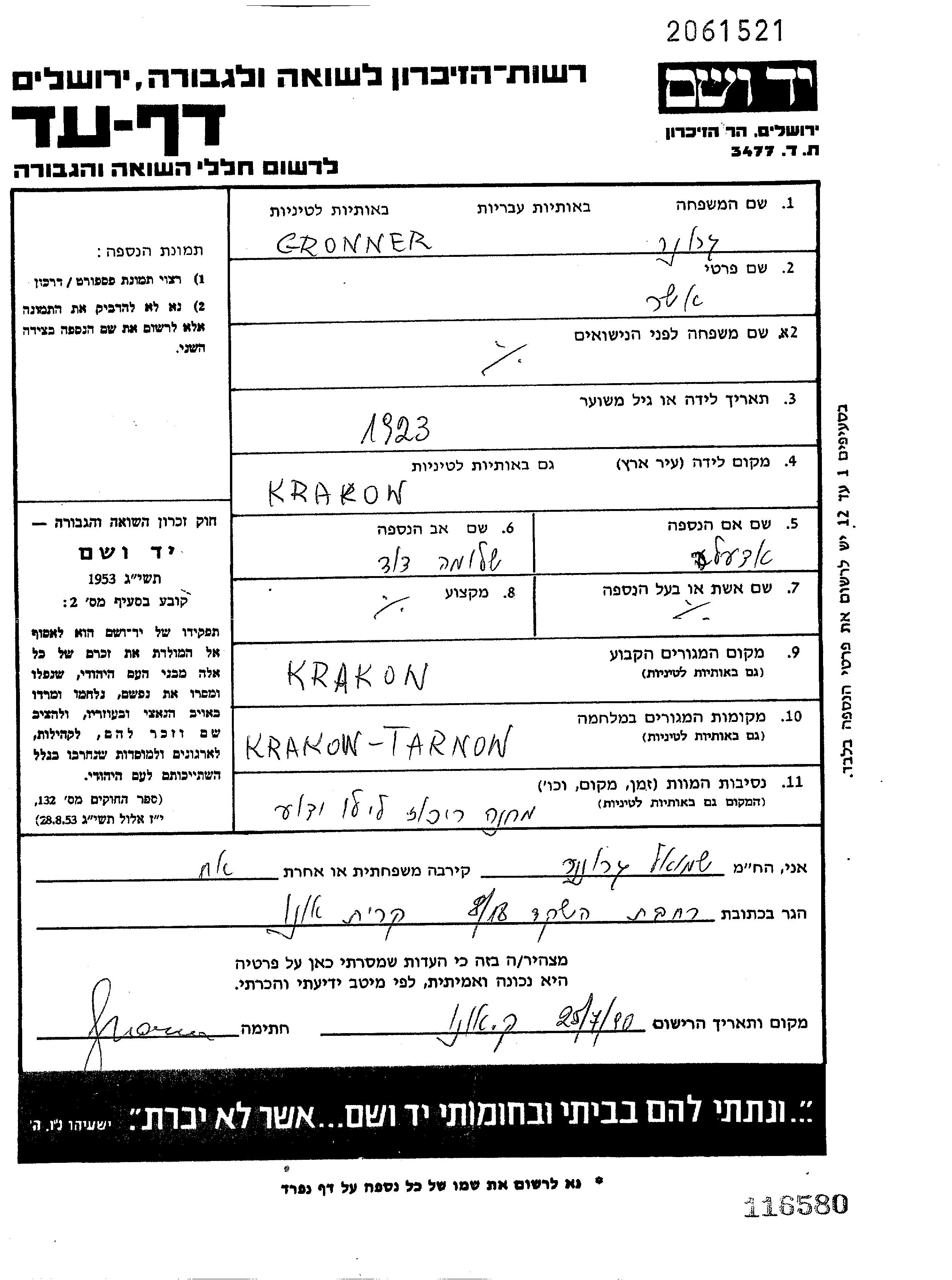 Гроннер Грунер | Ашер | 1923 | Краков, Польша | Лист свидетельских показаний |