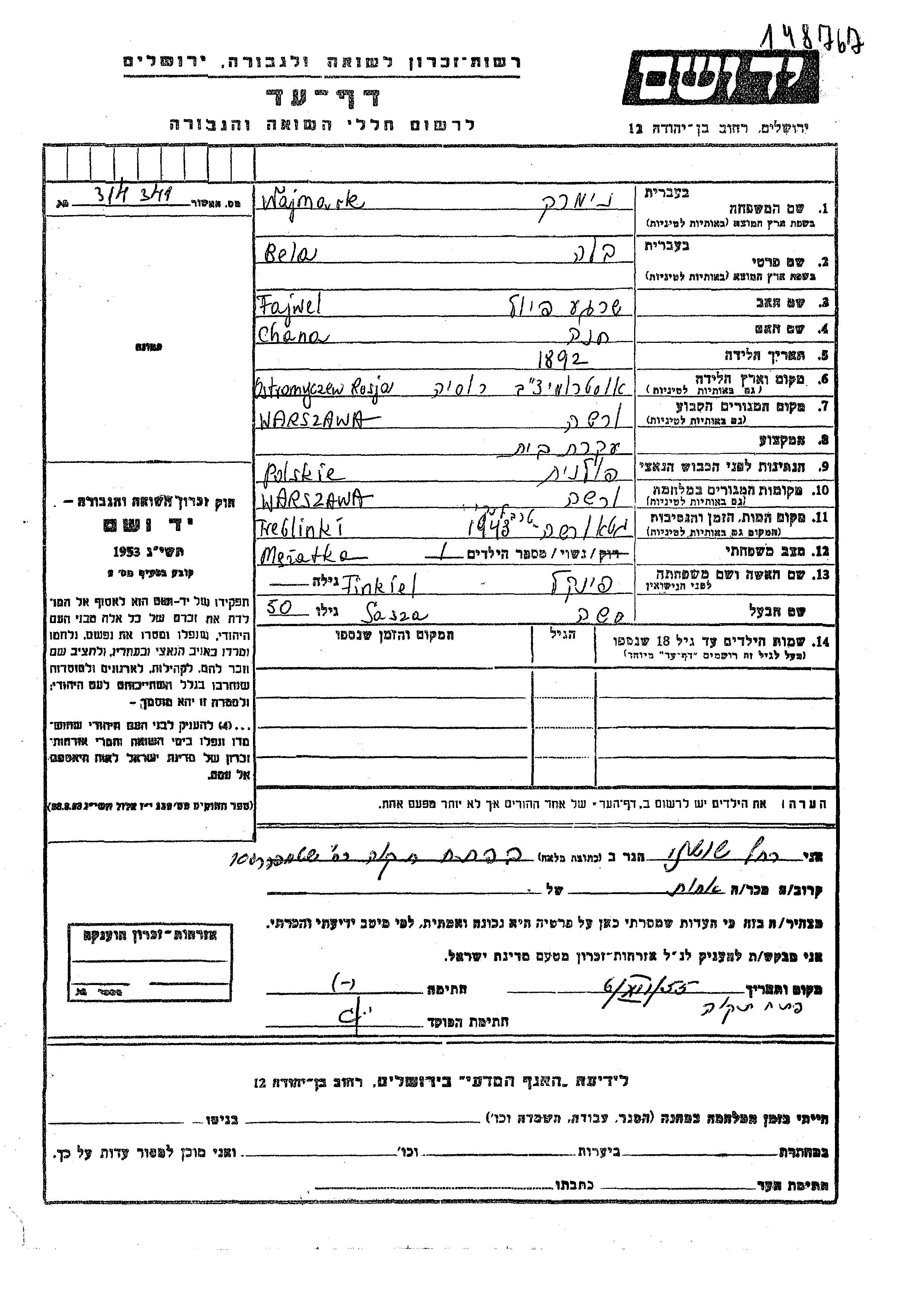 Бела Наймарк, девичья фамилия Финкель, место рождения: Остромечево, Польша. Домохозяйка. Место жительства до войны: Варшава, Польша.