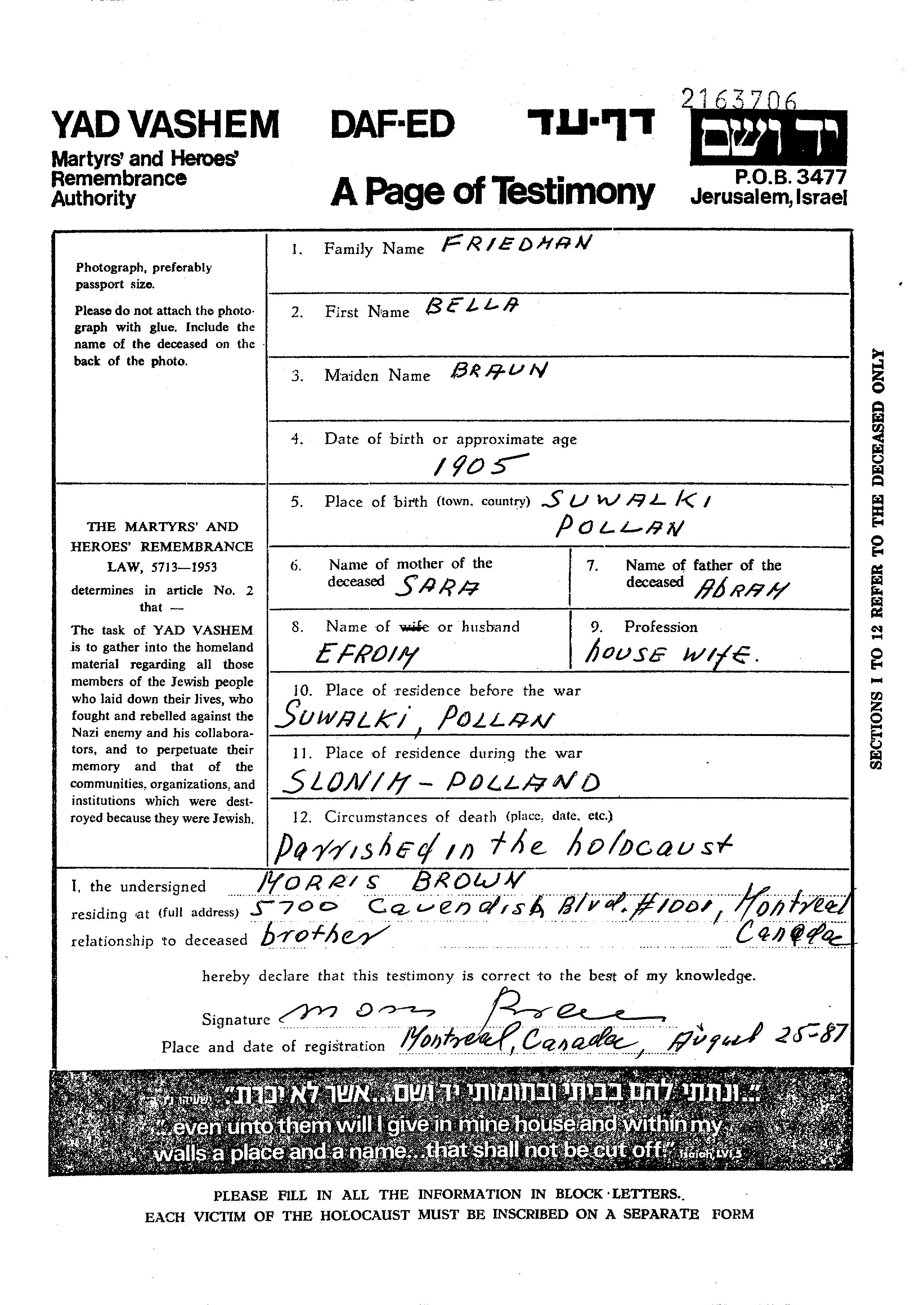 Бела Фридман, девичья фамилия Браун, место рождения: Сувалки, Польша. Домохозяйка. Место жительства до войны: Сувалки, Польша.